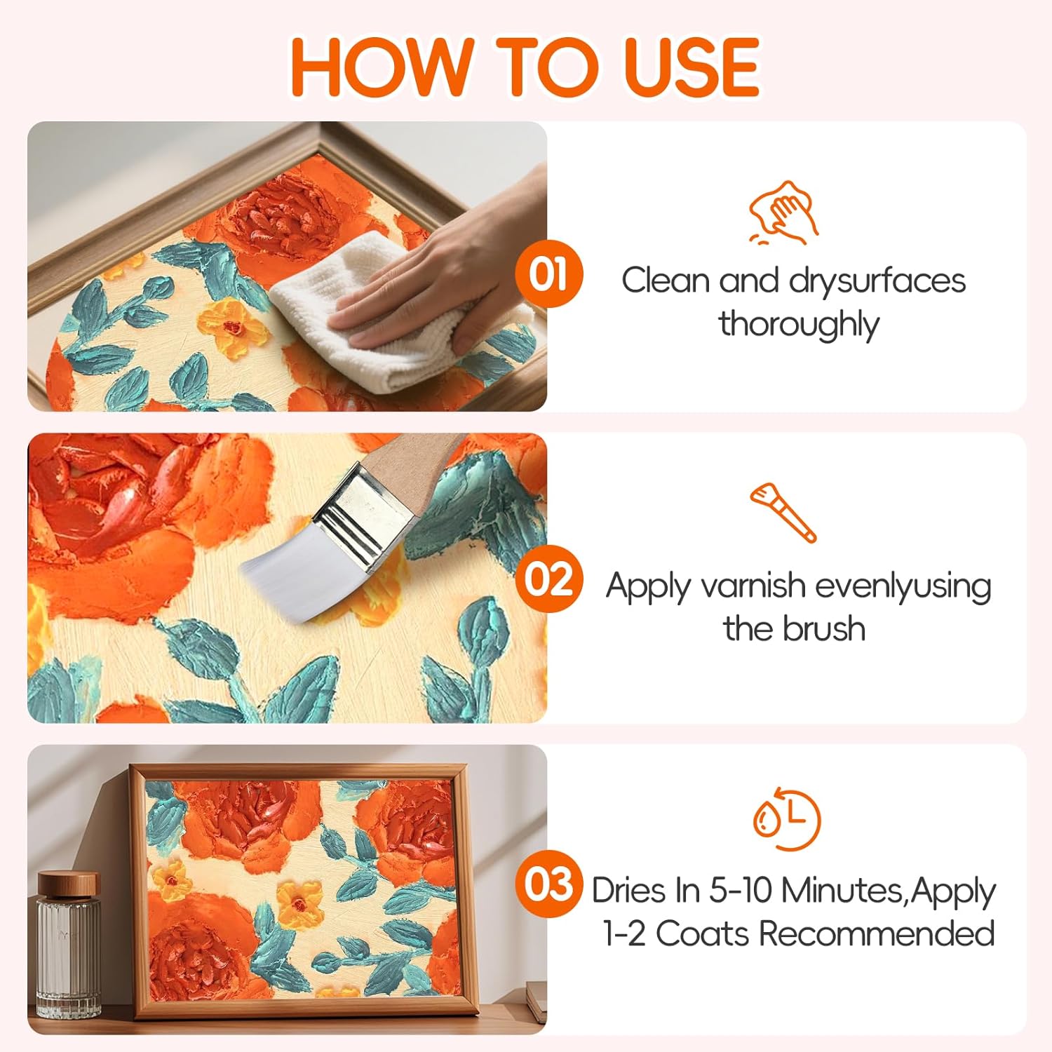 - Glossy Finish: Our varnish imparts a beautiful, high-gloss sheen to your acrylic paint artwork.