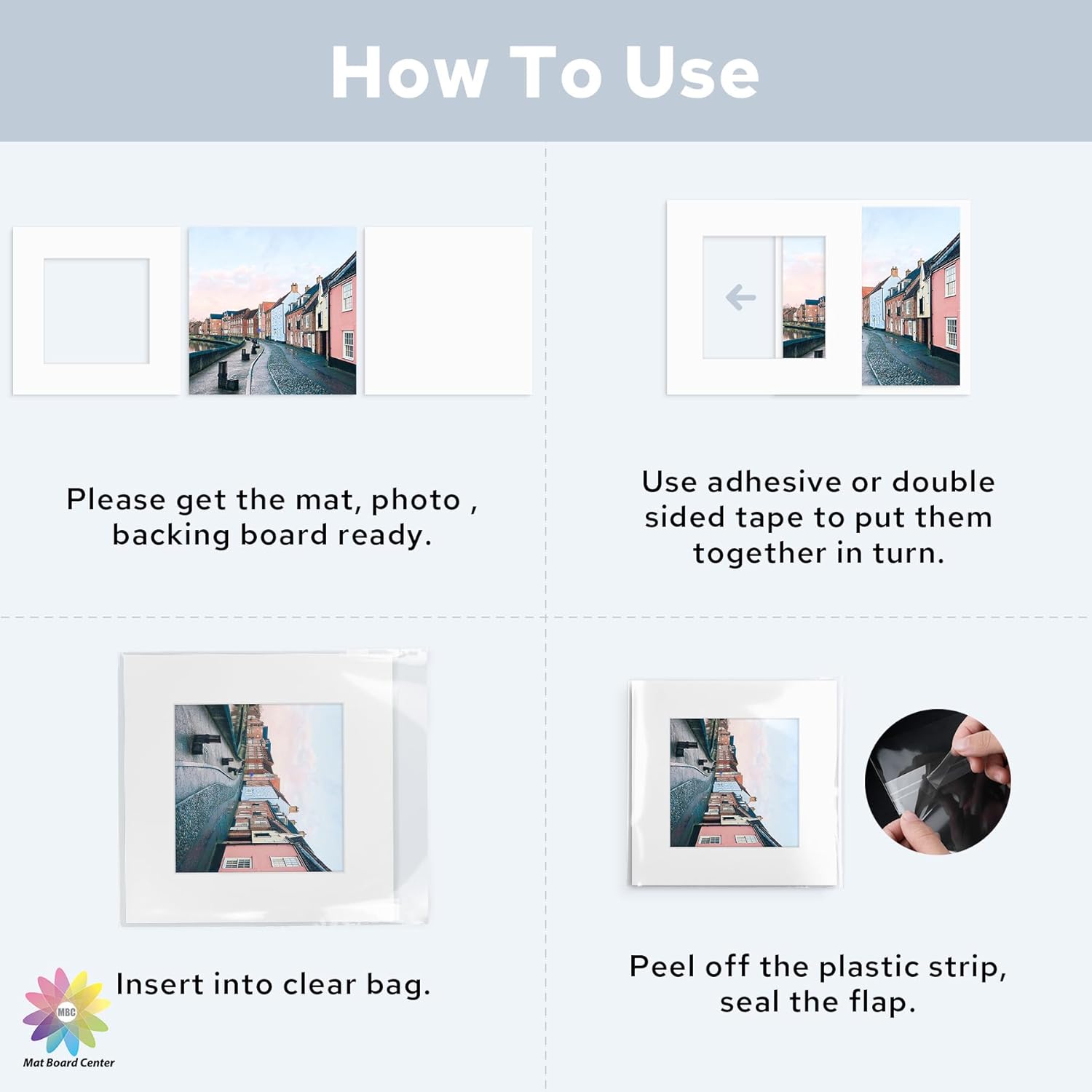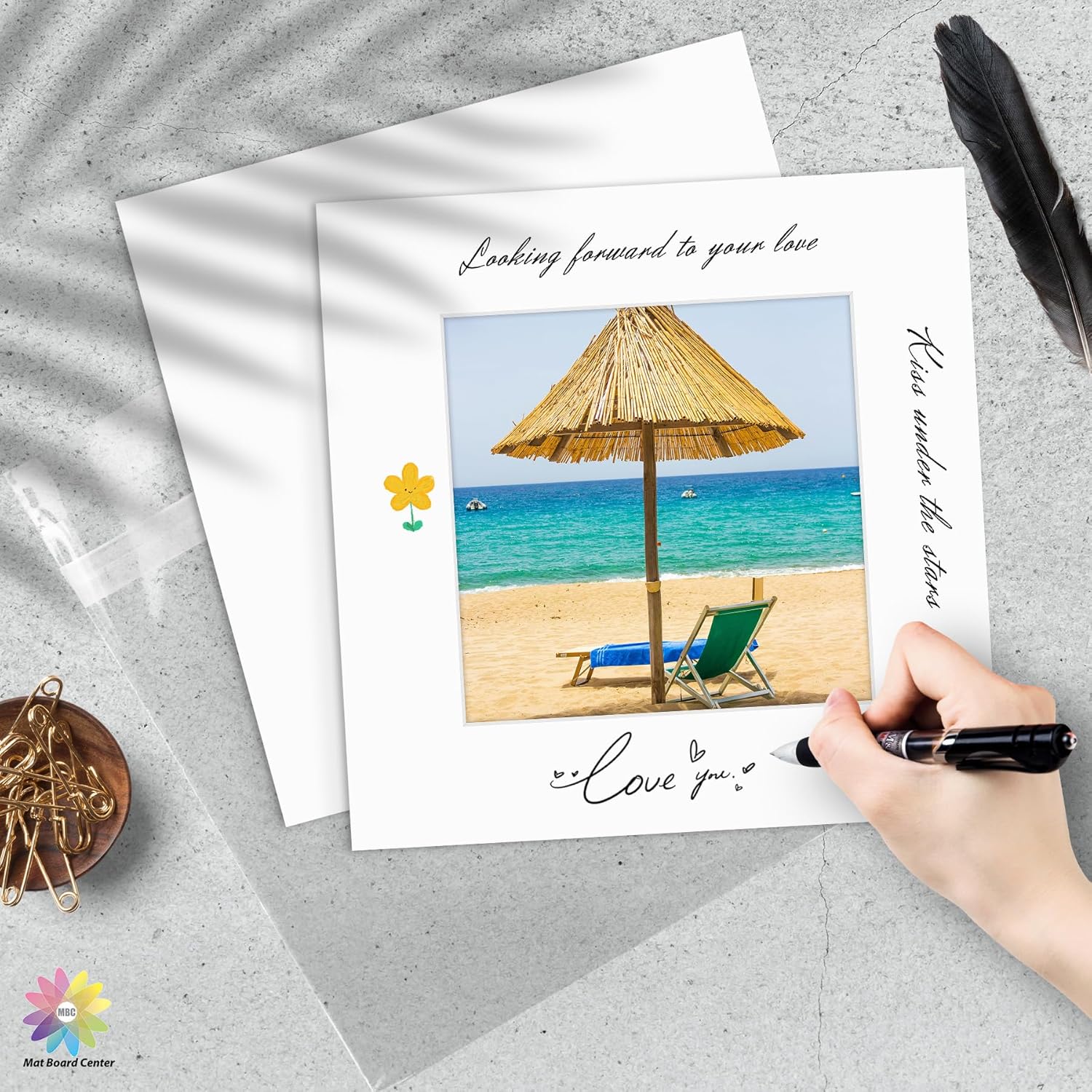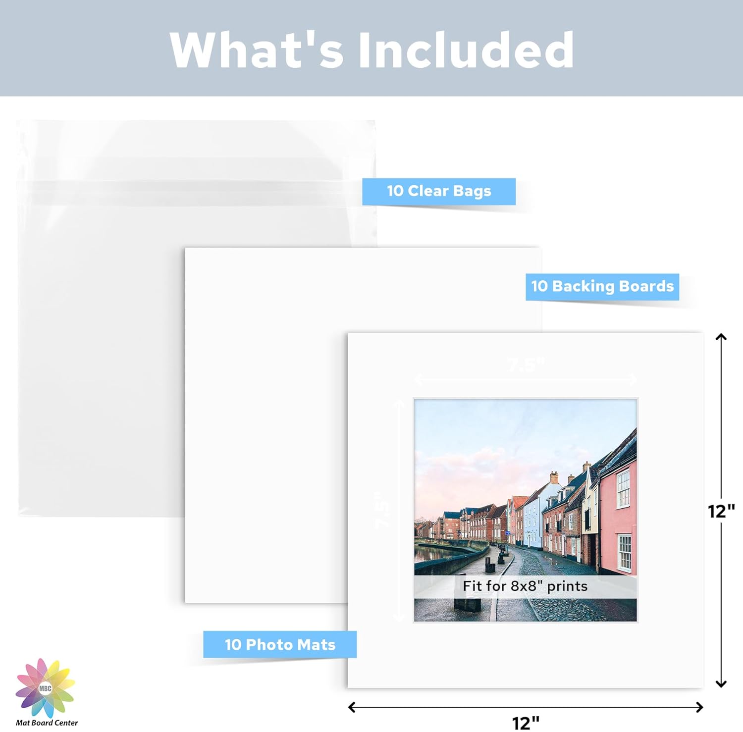Mat Board Center, Pack of 10, 12x12 for 8x8 White Mat Kit - Acid Free, 4-ply Thickness, White Core - Includes Backing Boards and Clear Bags - for Pictures, Photos, Framing