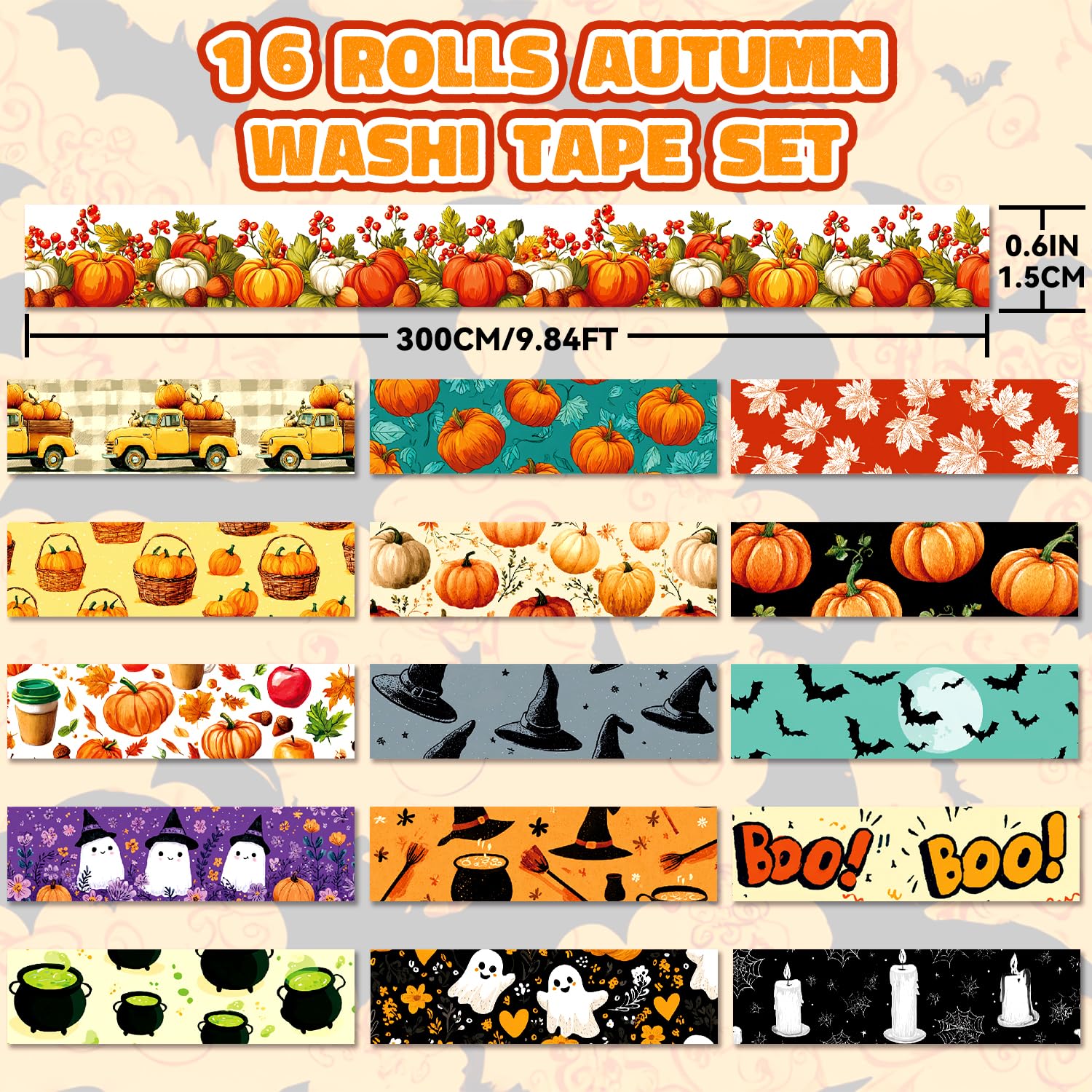 Halloween Washi Tape Set 16 Rolls, Fall & Spooky Decorative Tape, Autumn Washi Tape for Journaling, Crafts, Pumpkin Decor (0.6" x10 ft) - Autumn Leaves, Bats, Pumpkins, Vintage Horror