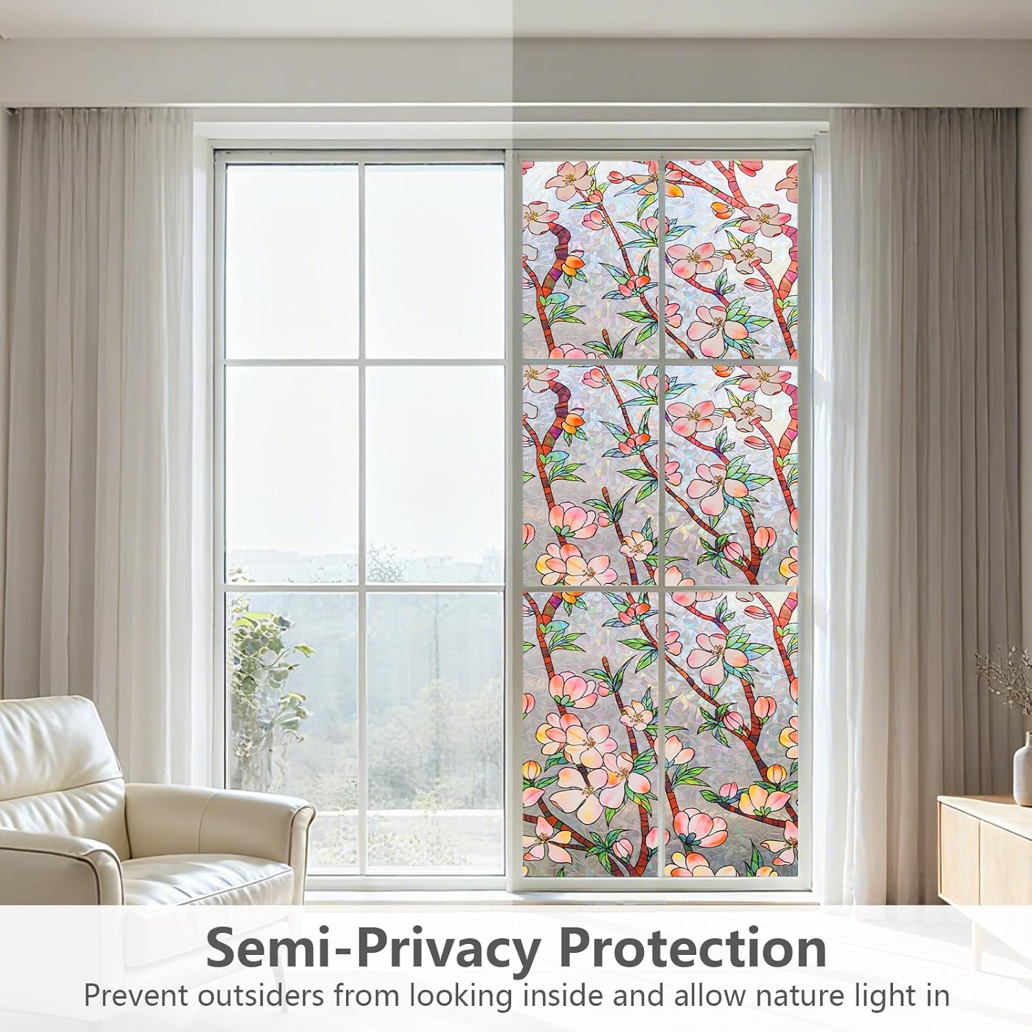NINETREX Window Privacy Film,3D Stained Glass Window Film,Rainbow Static Cling Stickers Blocks Heat & UV,Non-Adhesive Vinyl for Home Door (Peach Blossom,17.5 x 78.7inch)