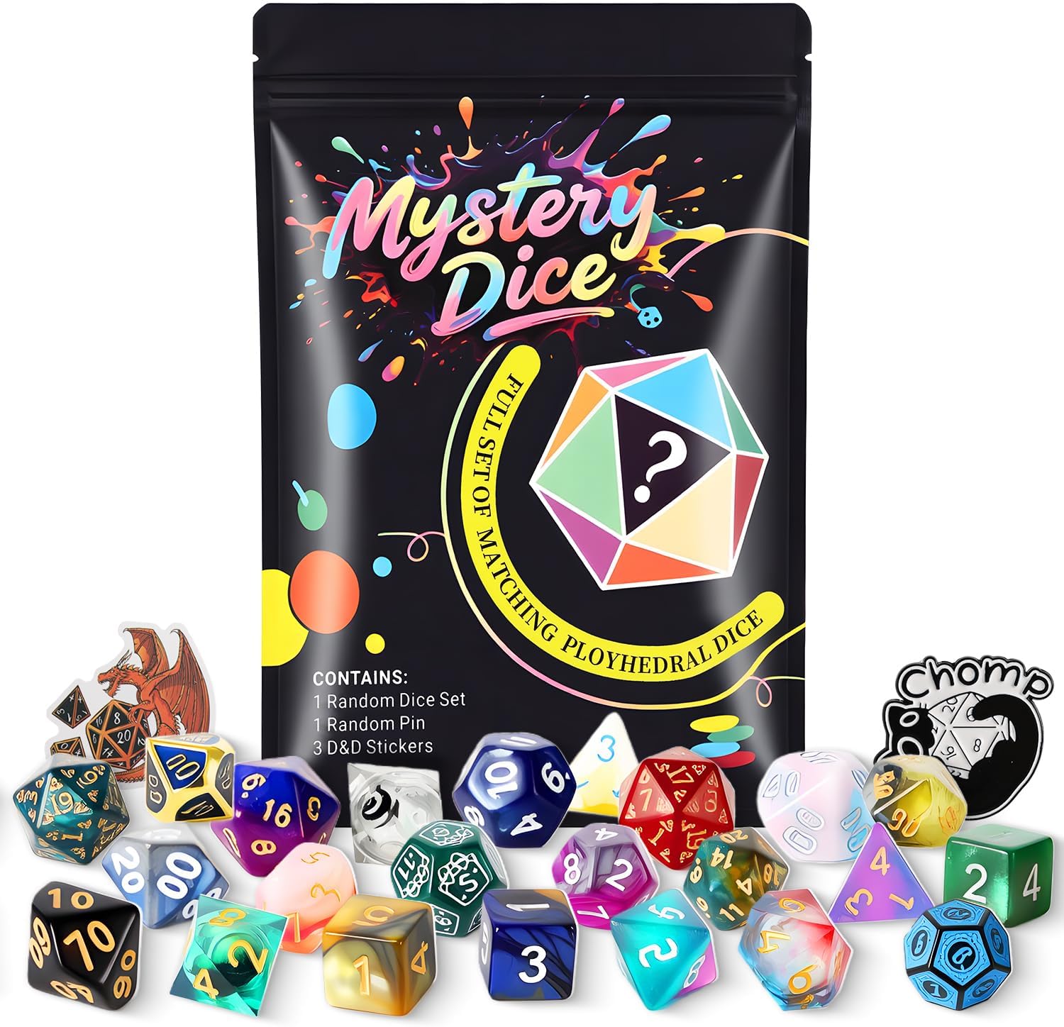 - Mystery Dice Set: 100+ stunning color and pattern combinations! Before opening the bag, you never know what amazing combination of dice you will discover. Give it a try and see what magical acrylic, metal, quicksand or filled resin dice you will get!