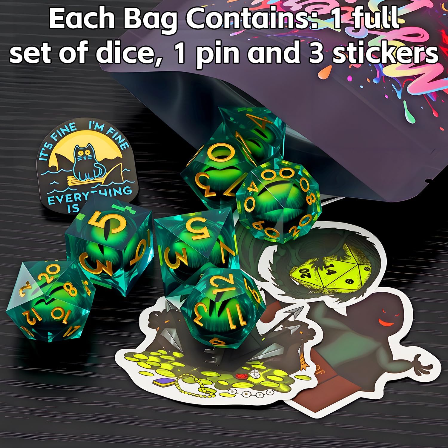 - Complete RPG Dice Set:Each pack includes a full 7 dice set, a enamel pin, and 3 DND dice stickers