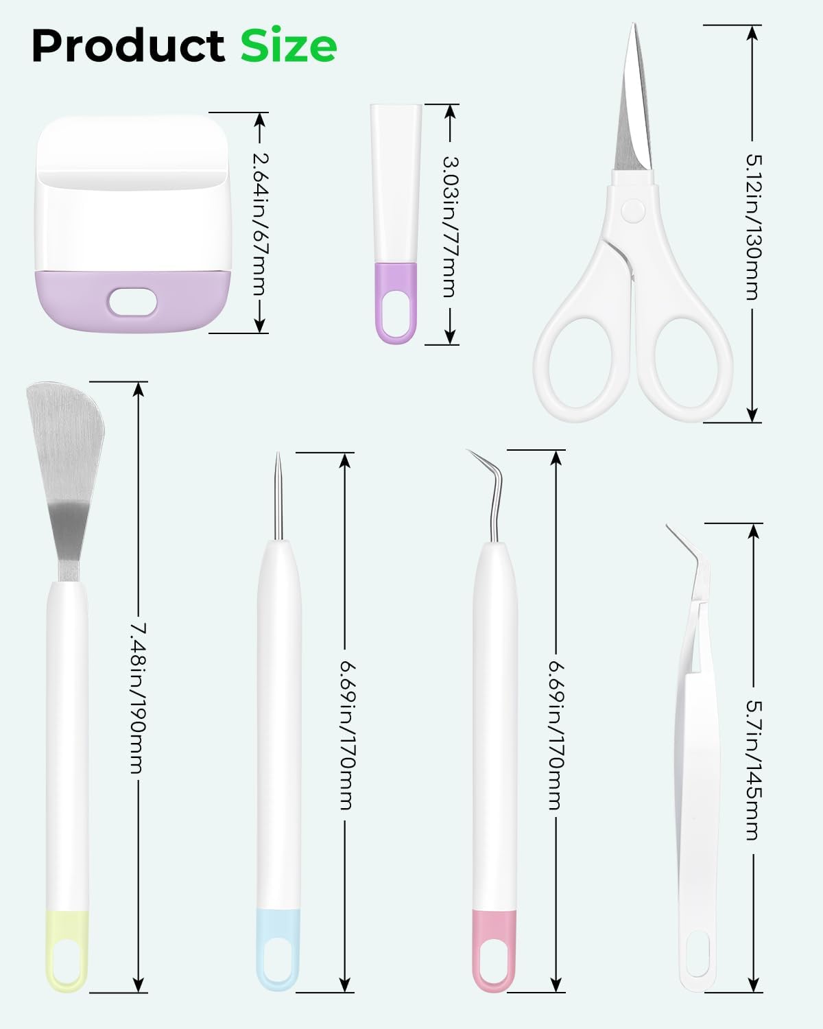 - 【Vinyl Weeding Tool Set】The package includes 1*A4 light board,1*Type-C charging cable,1 pair of tweezers,1*hook-shaped weeder,1*rectangular scraper,1*scissors,1*blade cover,1*piercing tool,and 1*spatula.With this set of tools,you can easily complete the entire process of vinyl weeding,cutting and pasting