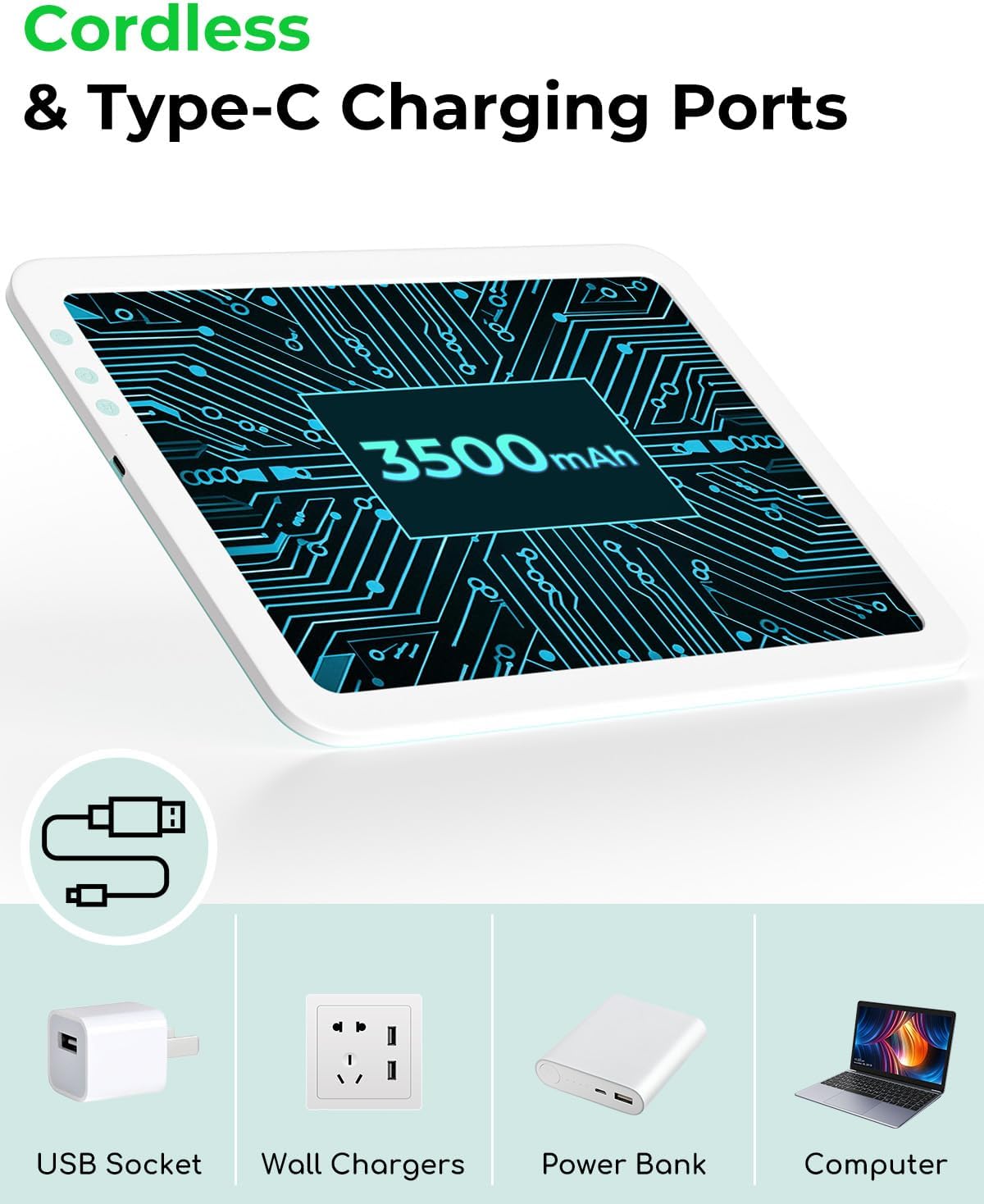 - 【Battery & USB Powered】The light board is equipped with a 3500mAh built-in battery.After 3.5 hours of charging,it can be used cordlessly at maximum brightness for 5 hours.It also includes a Type-C charging cable,enabling easy connection to power banks,laptops,USB adapters.When you're on the go,you can charge it by simply using any USB port.Once fully charged,it allows you to break away from the constraint of power cords,enabling flexible cordless use