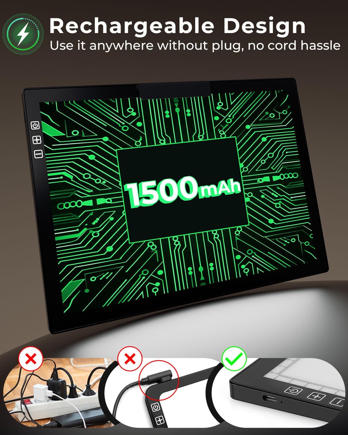 - 【Rechargeable Design】Our light pad comes with a built-in 1500mAh battery, no cords to deal with when you get fidgety and need to change sitting positions. Lightweight and portable, it frees you from location limits to dive into art anytime, anywhere