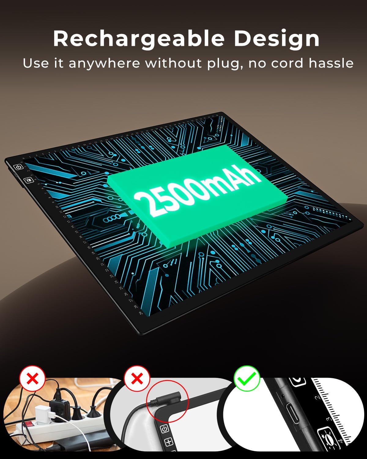 - 【Rechargeable Design】Our A3 tracing light box comes with a built-in 2500mAh battery, no cords to deal with when you get fidgety and need to change sitting positions. Lightweight and portable, it frees you from location limits to dive into art anytime, anywhere