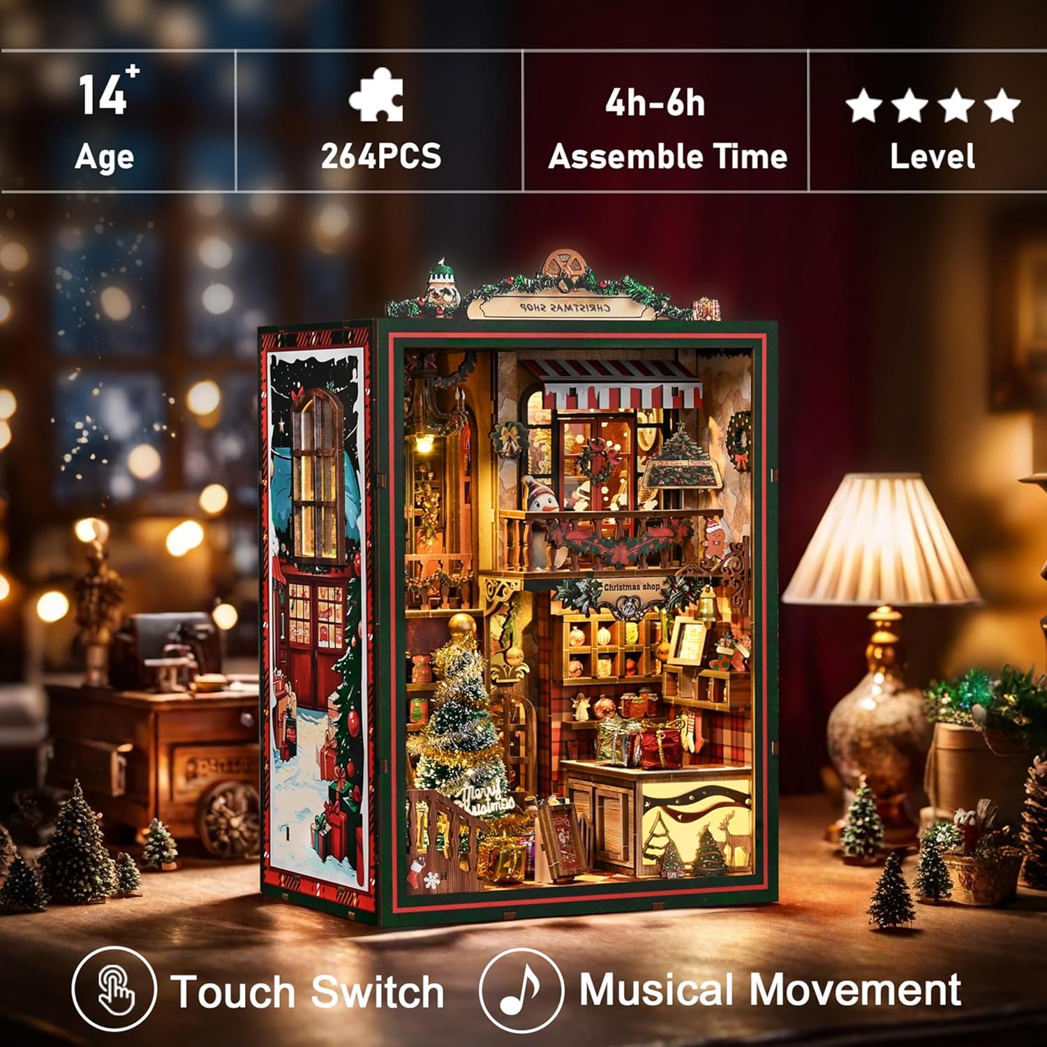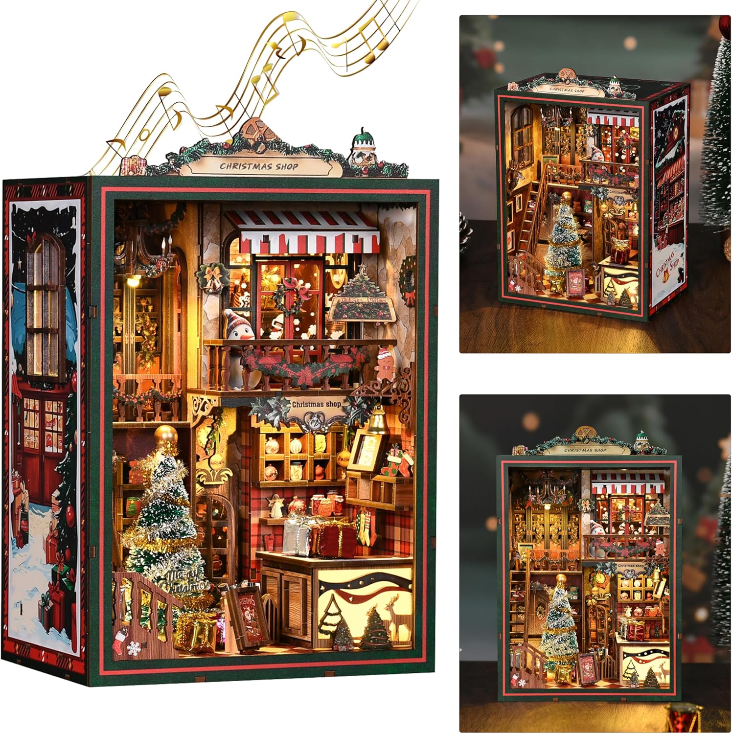 ISSEVE Book Nook Kit - DIY Miniature House Kit for Adults Teens Beginners, Christmas Dollhouse Booknook with Music Mechanism Tiny House Bookshelf Decoration 3D Wooden Puzzles (Christmas Shop)