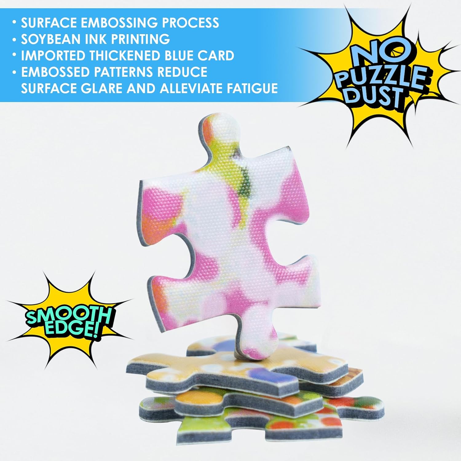 - Material & Craftsmanship: Imported professional blue card material cardboard, stiff & textured. Printed with soybean ink, safe, heat-resistant & friction-resistant. The surface of jigsaw puzzles for adults is embossed. The pattern does not easily fall off and is more textured. The double-sided paper mounting process increases the hardness by 15%. A single-piece puzzle is 2.6*2.6cm (1"x1"). The thickness is about 0.3cm (0.12"), which can be easily picked up by the elderly
