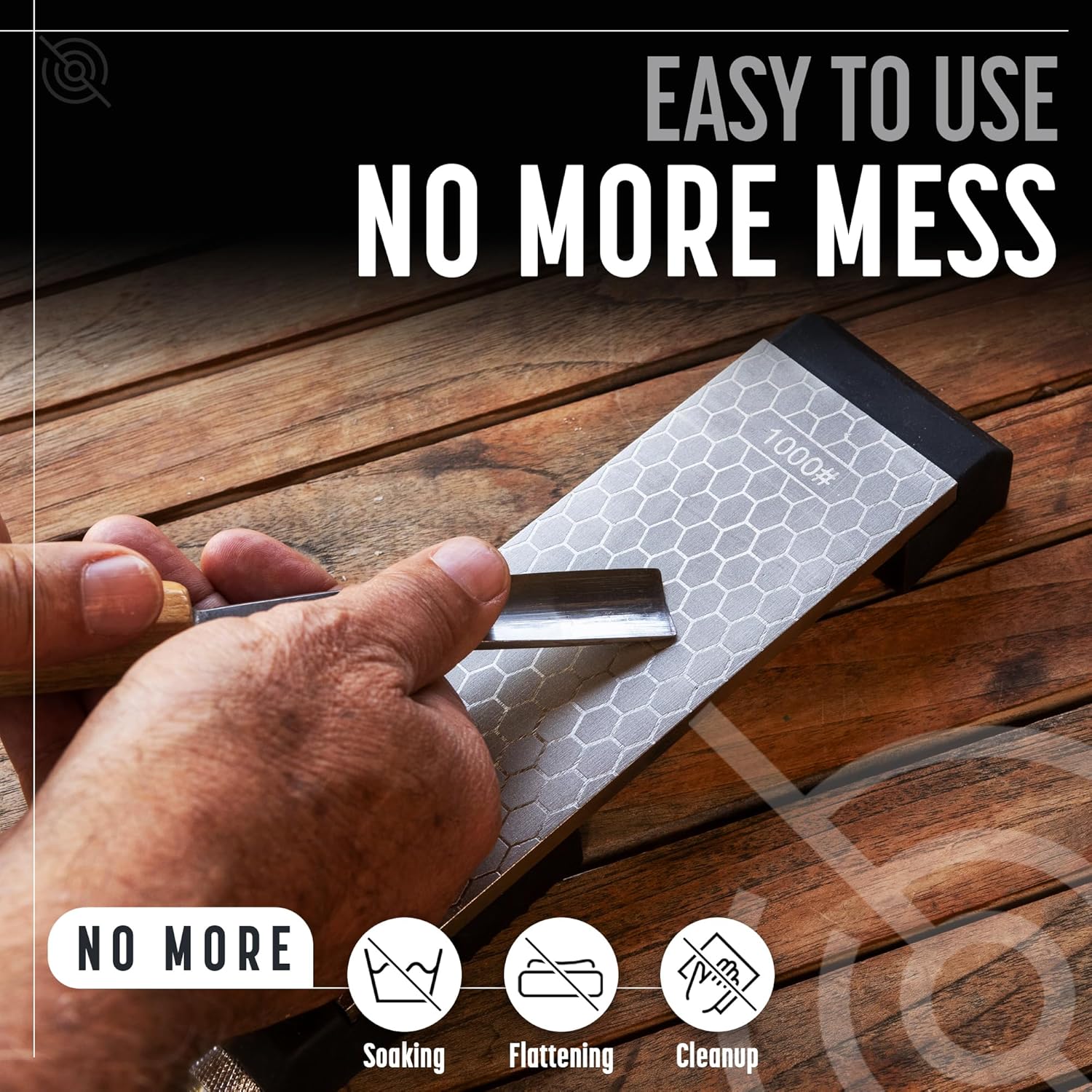 - SHARPEN ANY BLADE OR WOODWORKING TOOL - Large diamond sharpening stone accommodates kitchen knives, pocket knives, chisels, plane irons, scissors, axes, and wood carving tools. Functions as both knife sharpener and chisel sharpening kit for various blade maintenance needs in home and workshop settings.