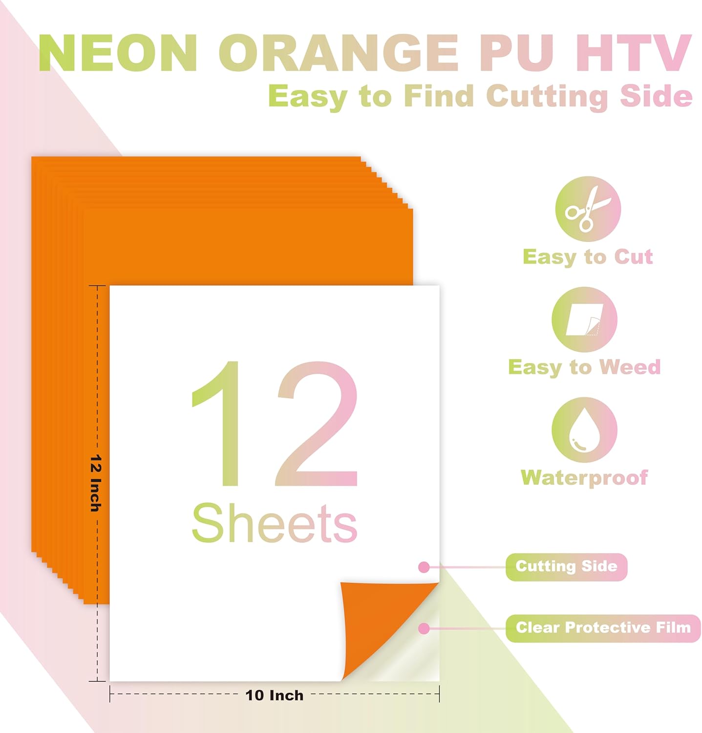 Neon Orange PU Heat Transfer Vinyl, 12 Pcs 12"x10" HTV Sheets – Soft & Stretchable Iron-On Vinyl, Easy to Cut & Weed, Compatible with Cricut & Silhouette – Great for DIY Family Shirts & Crafts
