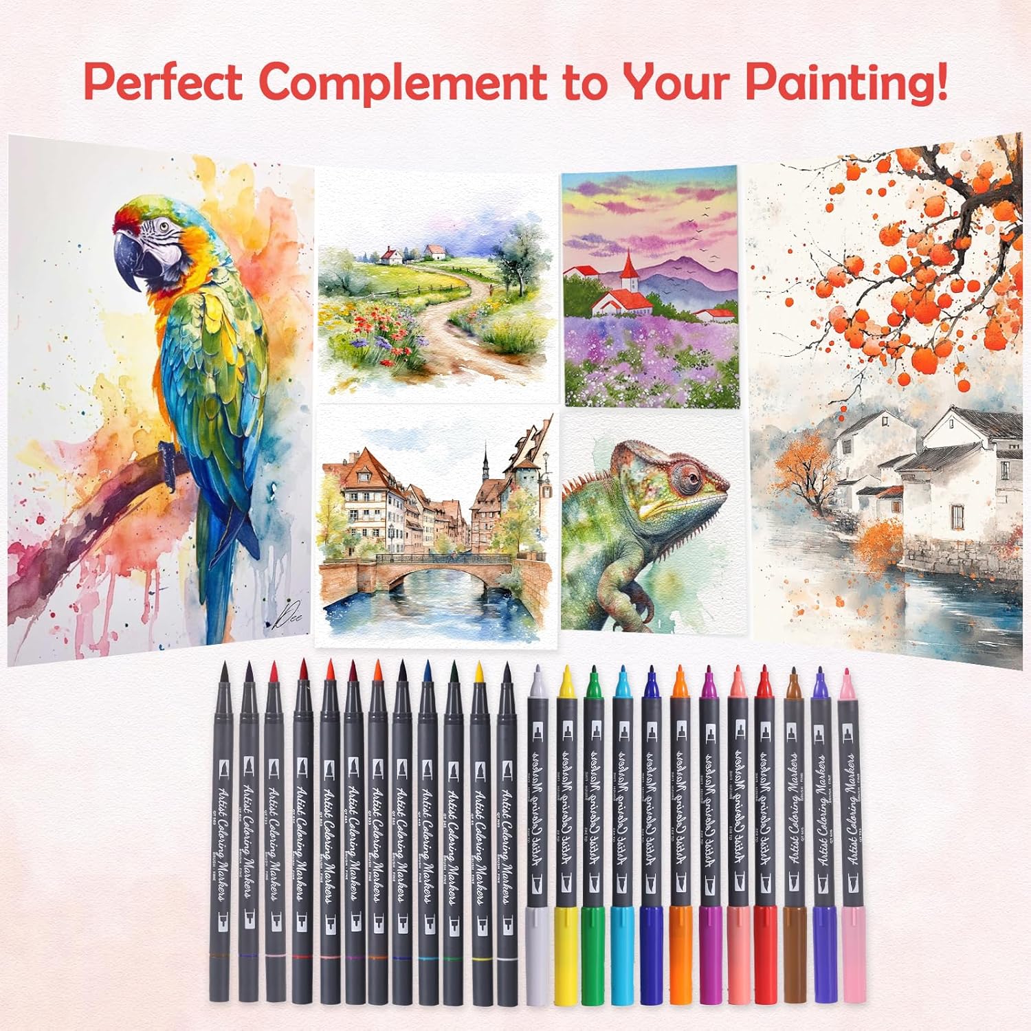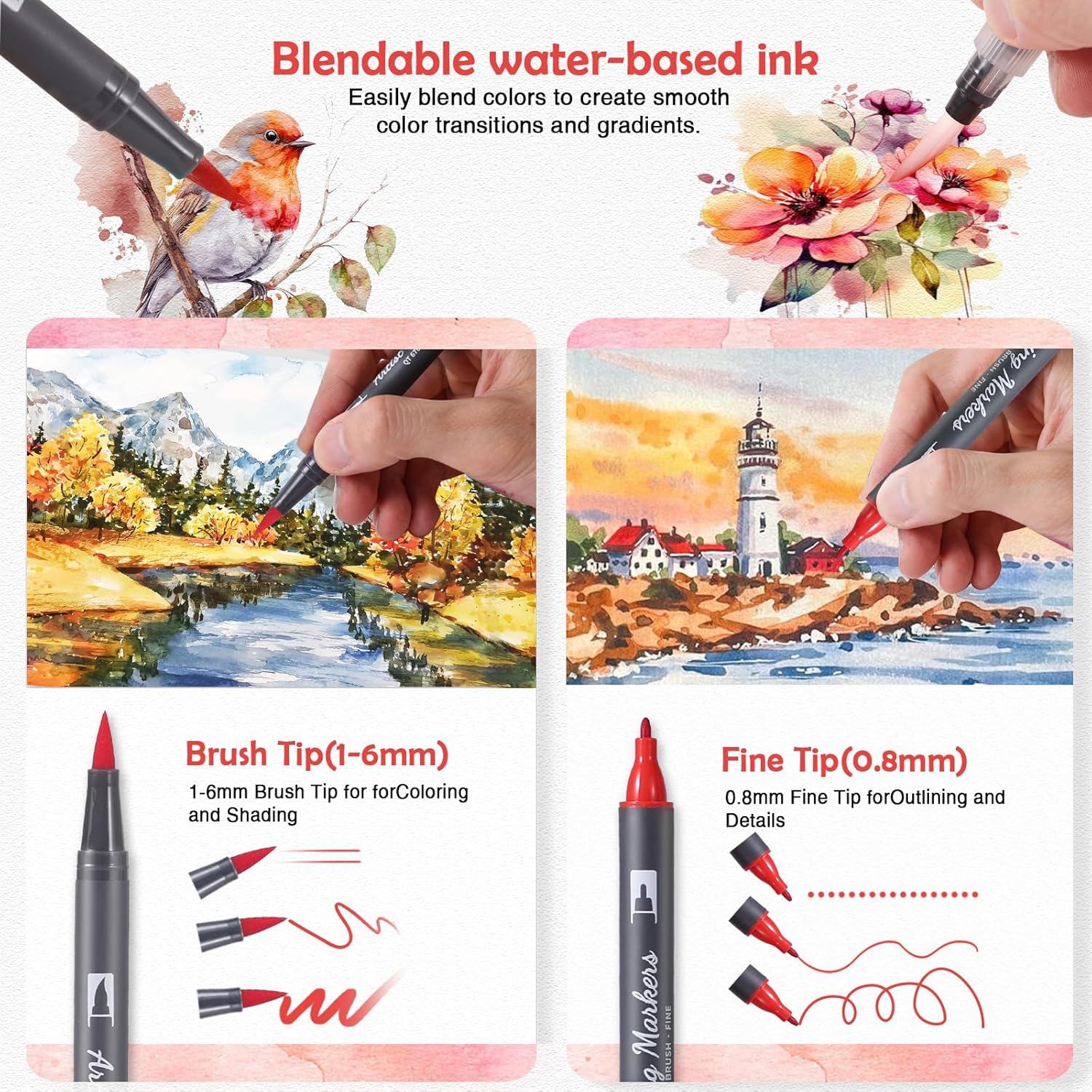- [ Brush & Fine Dual Tip Art Markers ] - Each brush tip marker has a double-ended design, providing great versatility. These color markers are ingeniously designed with a precise 0.8mm tip for detailed artistry and a versatile brush pen tip that adjusts from 1 to 6mm, perfect for everything from meticulous illustrations to bold calligraphy. You can choose the fine tip for sweeping, details, calligraphic strokes or the broad brush tip for quickly color in large areas.