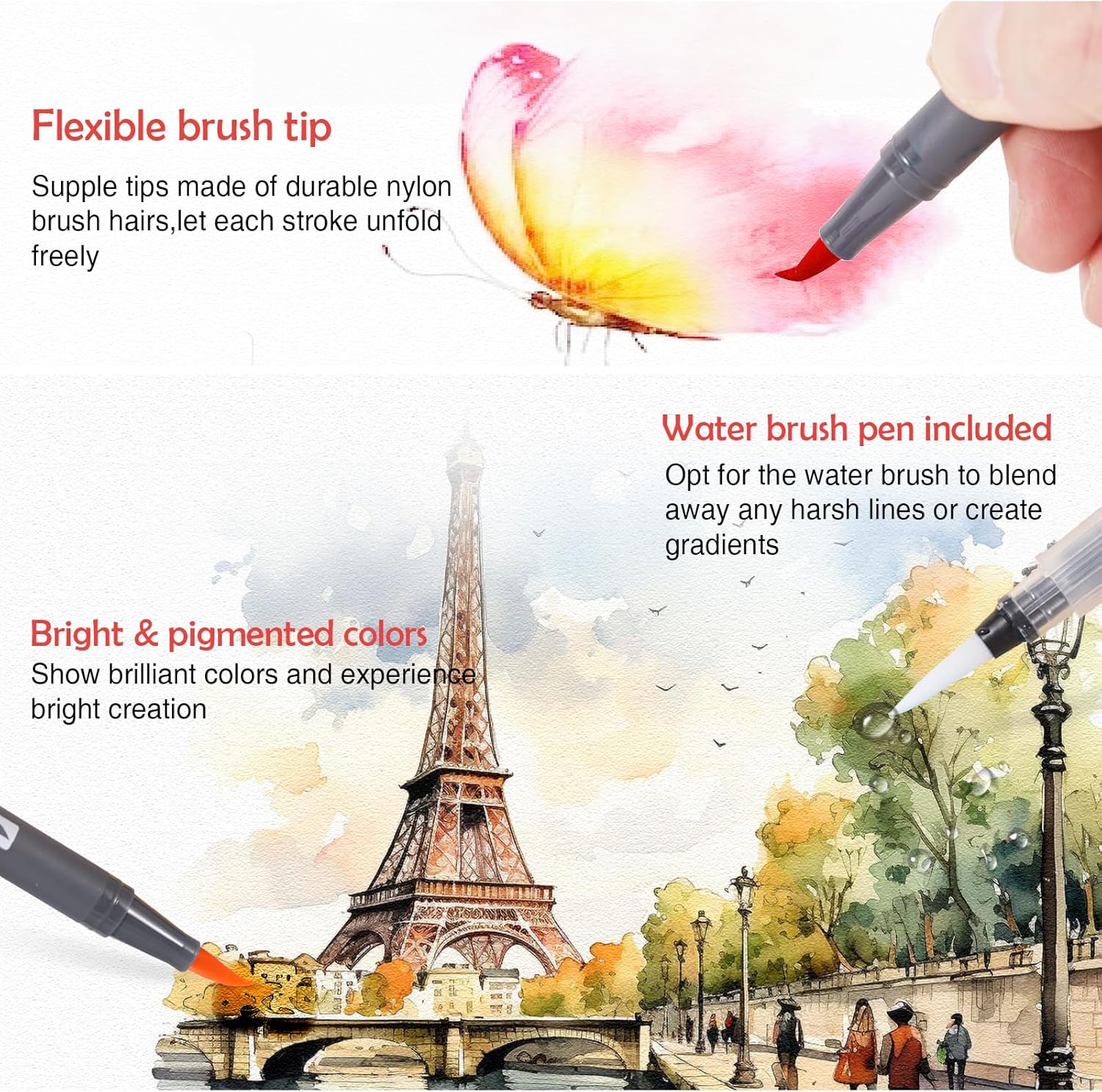 - [ Flexible Brush Tip & Self-Cleaning ] - Toshare Watercolor Brush Pens with flexible brush tip, which is made of smoothand resilient nylon fibers, fine bullet tip is strong and fimm, making them durable enough to take on pressure withstand pressure and maintain resilience even after extensive use! Both the brush tip and the fine tip of the Dual Brush Pens are easy to clean by scribbling on a piece of scrap paper, keeping the colors pure and accurate.