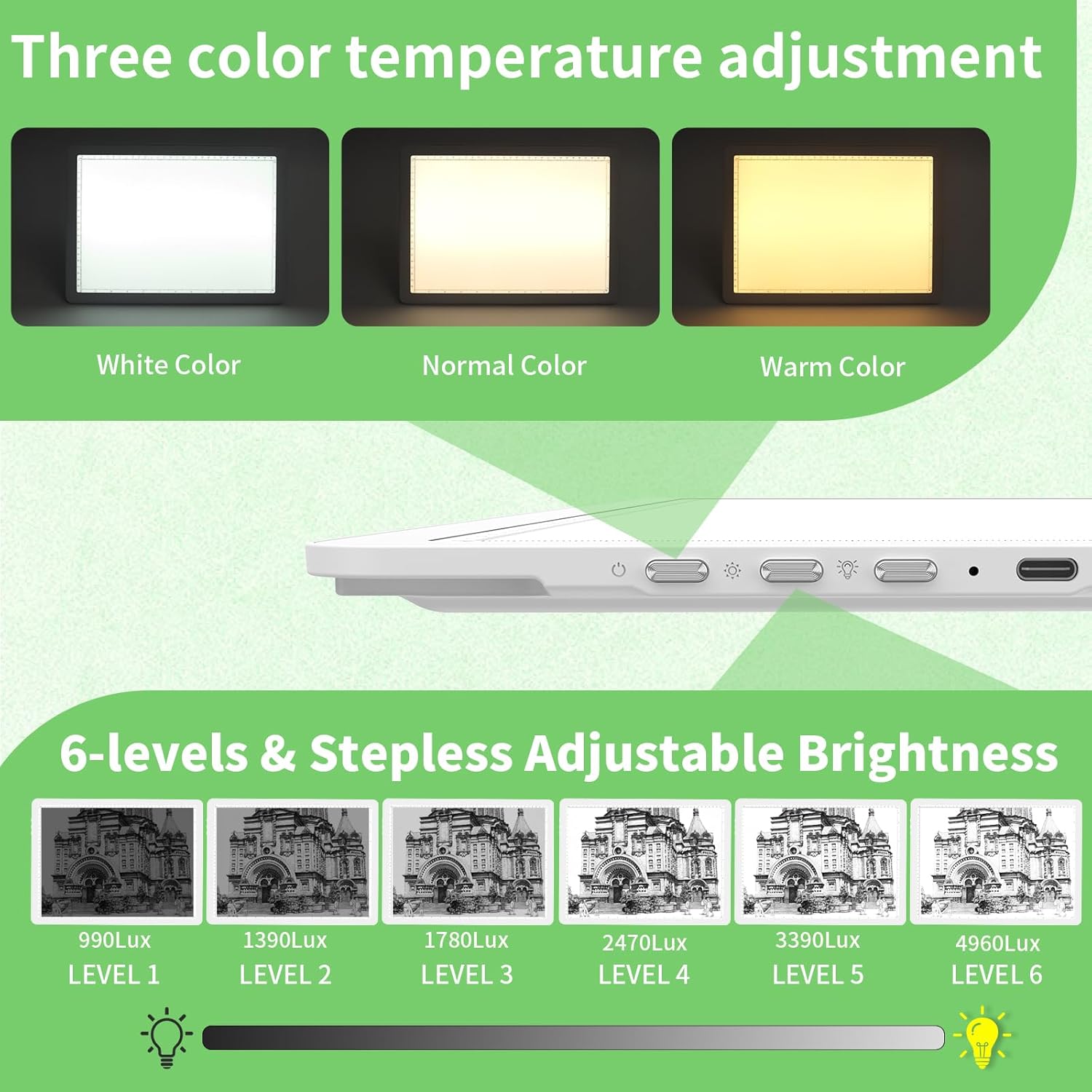 - 【3 Light Color Modes and 6 Levels/Stepless Dimming】This lightpad supports 3 colors of white light, natural light and warm light. Each lighting mode has 6 brightness dimming options. By shortly press the physical button to choose 6 levels brightness OR by long press the physical button to stepless adjust brightness. The Drawing Lightbox MAX brightness reach to 4960 Lux in the surface, which is great tool for cricut weeding vinyl. The light is even, non-glaring, no more eye fatigue when painting.