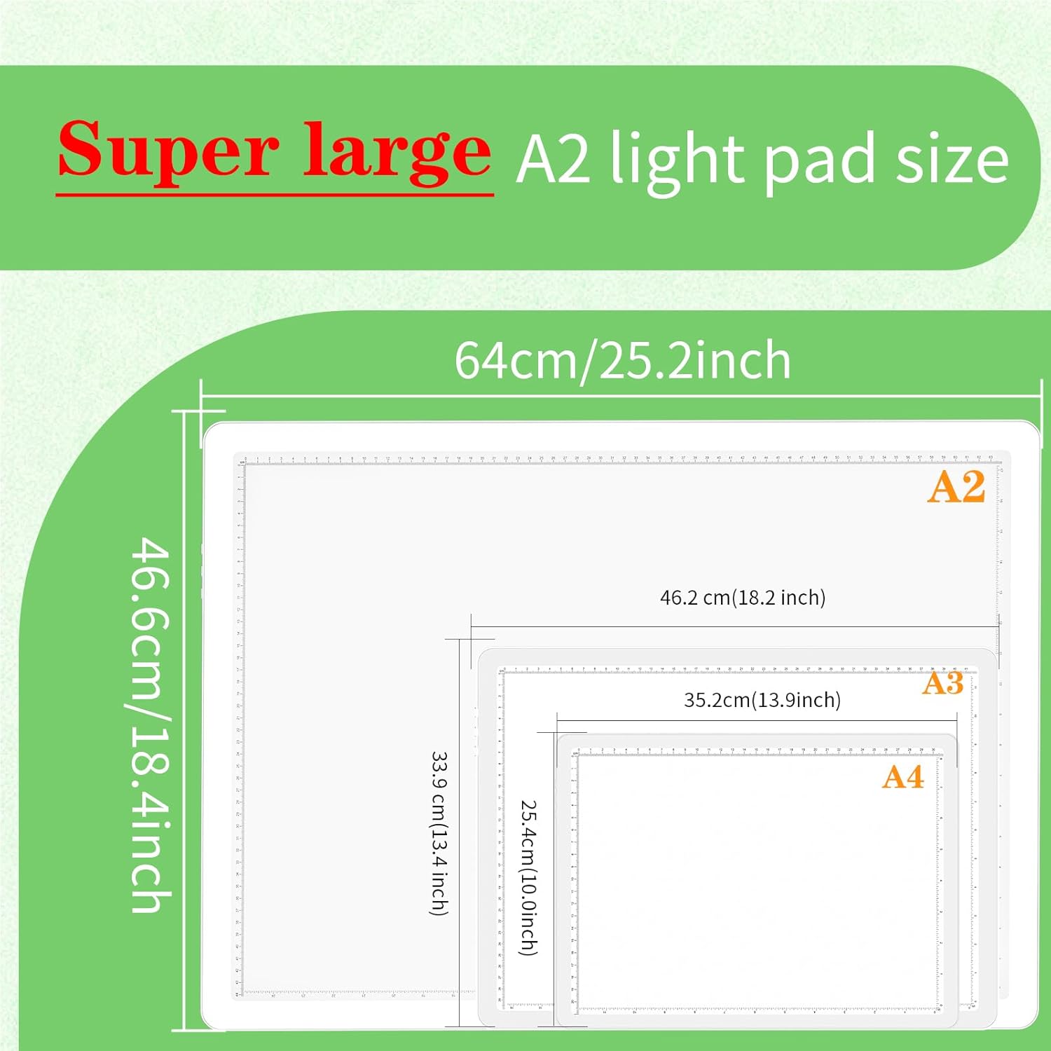 - 【 Standard A2 size, CM-INCH double scale 】 This Cordless Artist Tracing Light Box Copy Table overall size is 25.2 x 18.4 x 0.47 inches( 64 x 46.6 x 1.2 cm) and the visual working area is 16.8 x 12.0 inches(42.6 x 30.5 cm) . The lighting area is large enough to fit international standard A2 paper. This Light Drawing Sketch Pad has a dual scale of centimeters and inches to meet your various usage habits.
