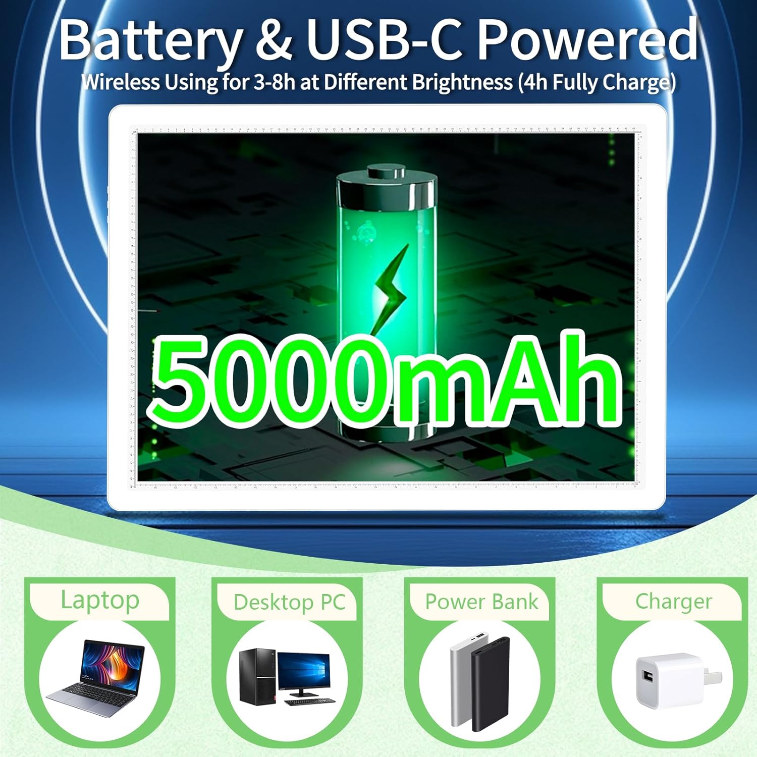- 【 Wireless A2 Tracing Lightbox 】 With the built-in 5000mAh lithium battery, Phylosal LED Light Drawing Board allows you to work for 3-8 hours wirelessly with the different brightest mode continuously. It's more convenient for you to use this cordless Light Table anytime and anywhere without bringing any adaptors, USB cord, or power bank. Easy to carry and charge.