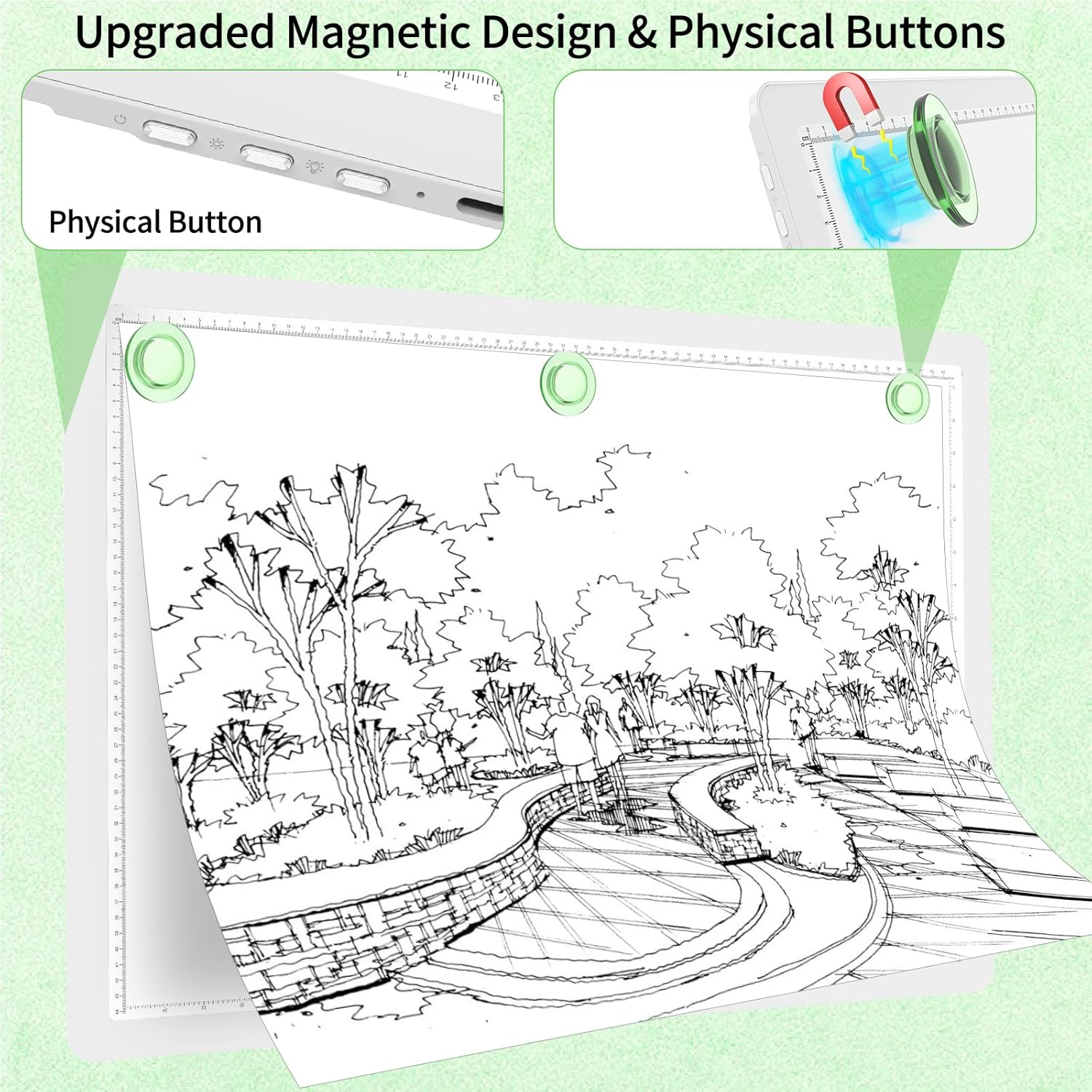 - 【 Upgradated Physical Buttons Design & Magnetic Design 】 This new designed tracing pad uses physical button instead of touch sensor switch, Preventing any mistakenly touching by your hand or the things nearby, effectively avoid mistakenly touching compare with touch sensor button. In addition, the 6 magnets can be adsorbed around the light pad, which can firmly fix diamond painting canvas/paper/X-ray or other things on the surface of the light box, bringing great convenience to your creation.