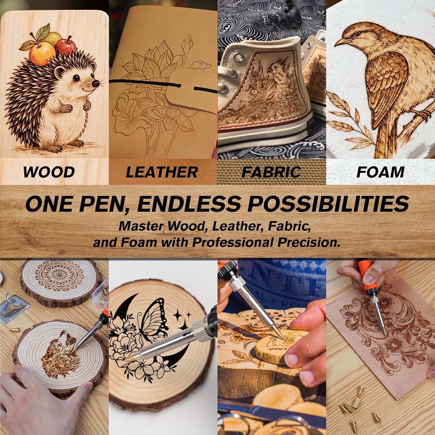 - Multi-Craft Pyrography & Design: Go beyond wood! Our premium wood burning kit is the ultimate all-in-one solution for crafters. Master pyrography on wood, leather, foam, and fabric with our professional adjustable temperature wood burning pen and an extensive set of 14 specialized tips. This pyrography wood burning kit unlocks endless creative projects, from custom leather branding to intricate foam designs and unique fabric art - the perfect wood burning kit for creative pursuits.
