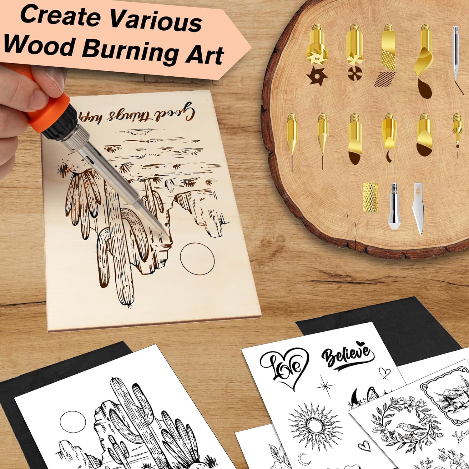 - Included Components : wood burning pen, 12 assorted tips, stencils, real wood slices, watercolor paints and more