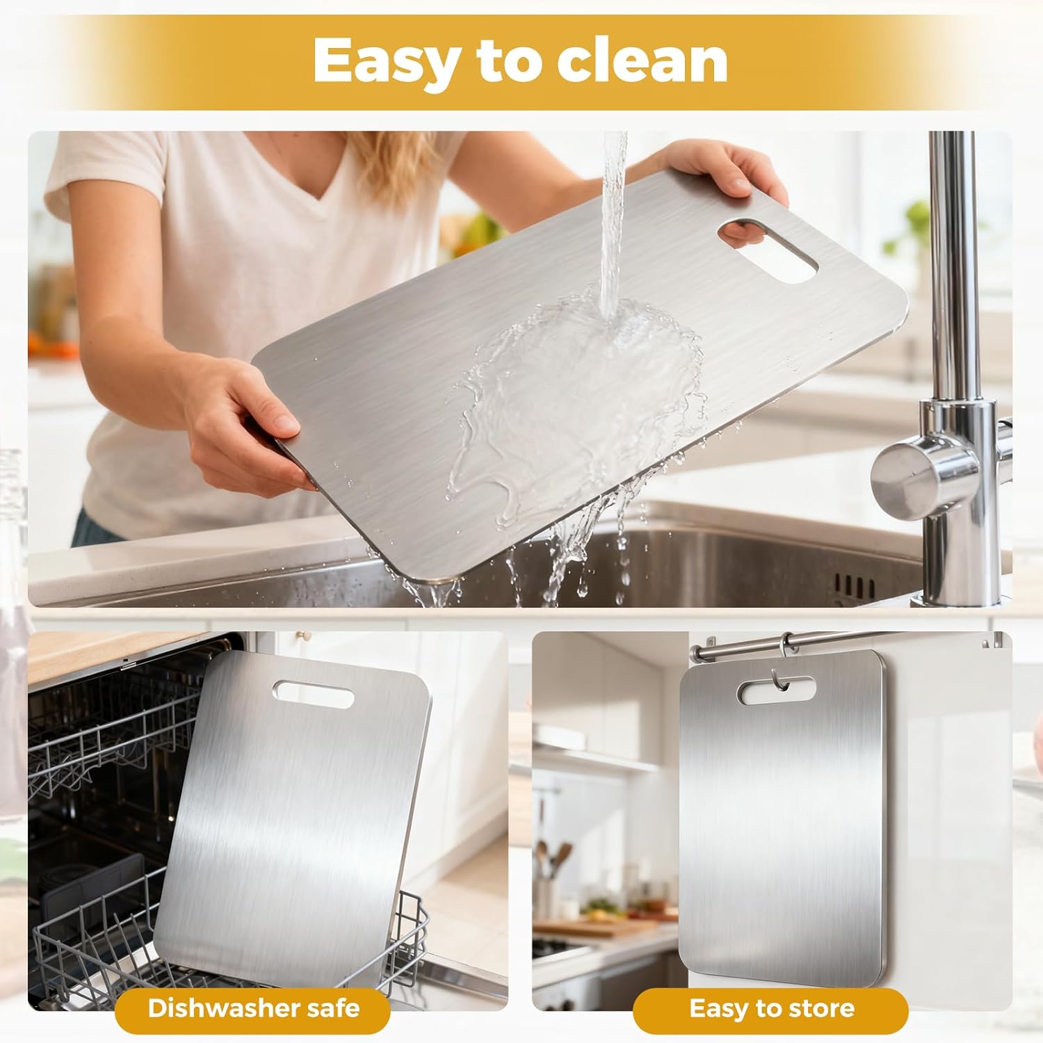 - EASY TO CLEAN:This titanium cutting board cleans effortlessly—just wipe with water, and it’s ready for next use. Lightweight for portability, yet sturdy enough to resist deformation or breakage.
