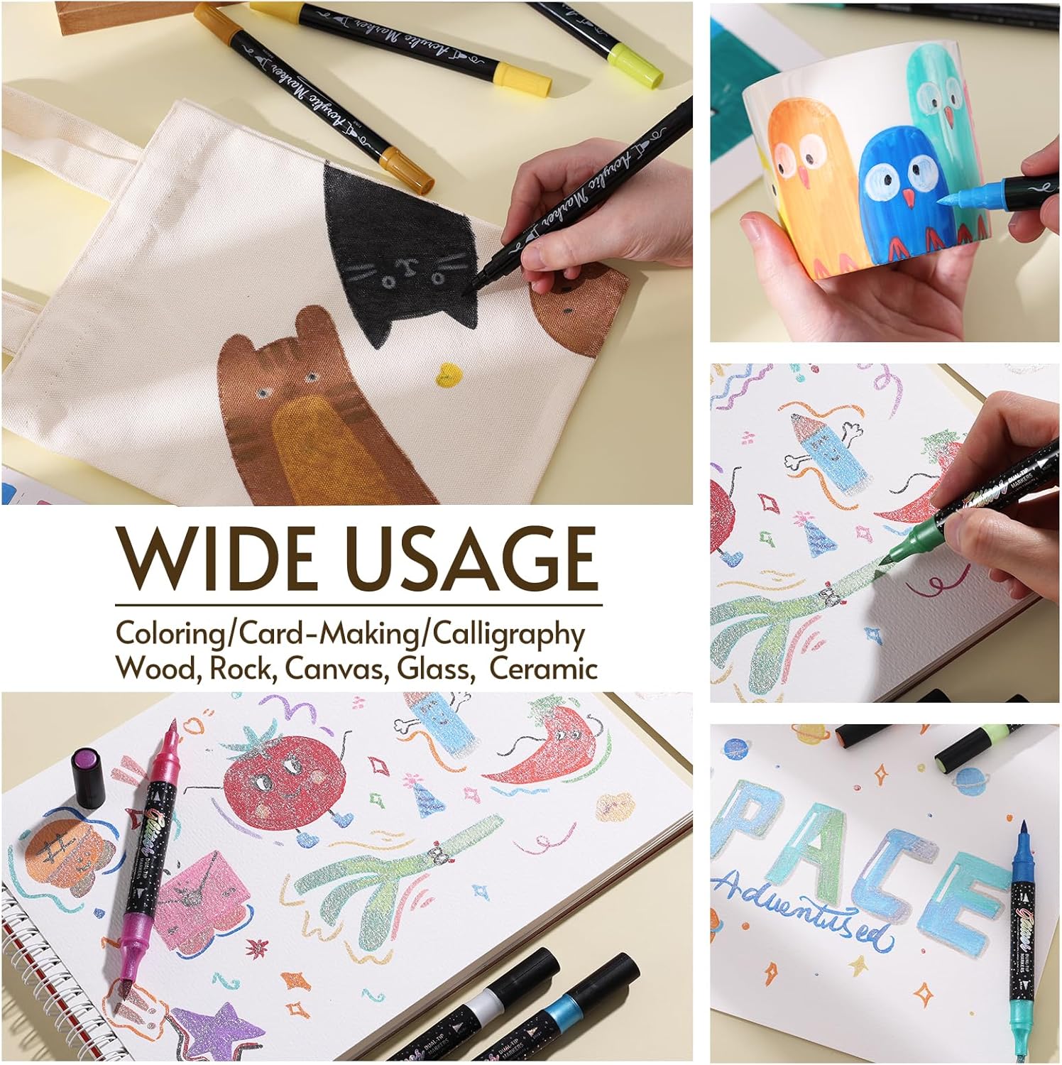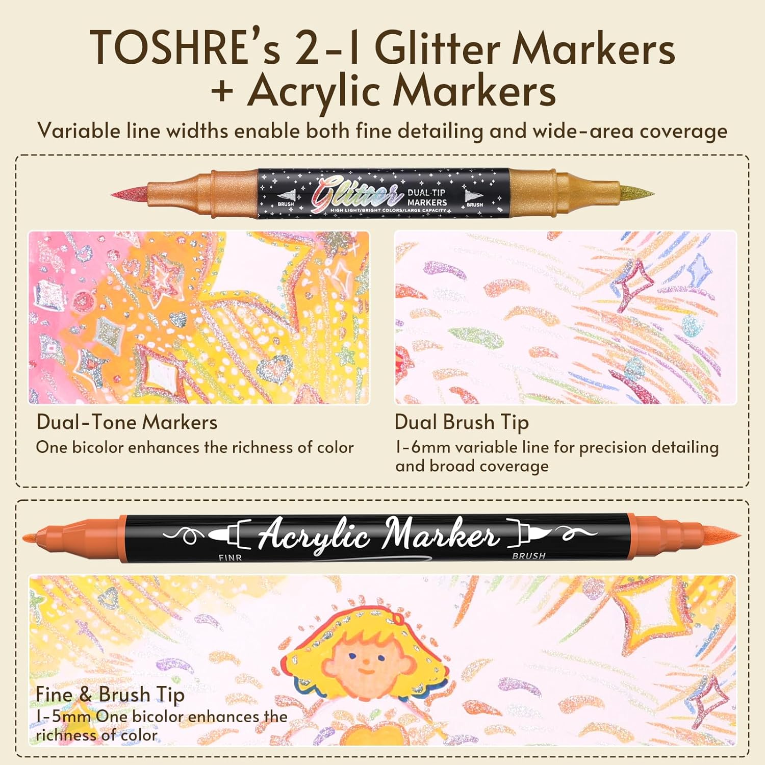 - Dual Tip Marker Design: TOSHARE Glitter Markers feature dual brush tips (1-6mm) for shimmering details and fills. The Acrylic Paint Markers combine a fine tip for precision outlining and a brush tip for broader strokes (1-6mm), offering ultimate control on virtually any surface. Our double-ended design offers ultimate versatility for coloring, painting, outlining, lettering, and shading.