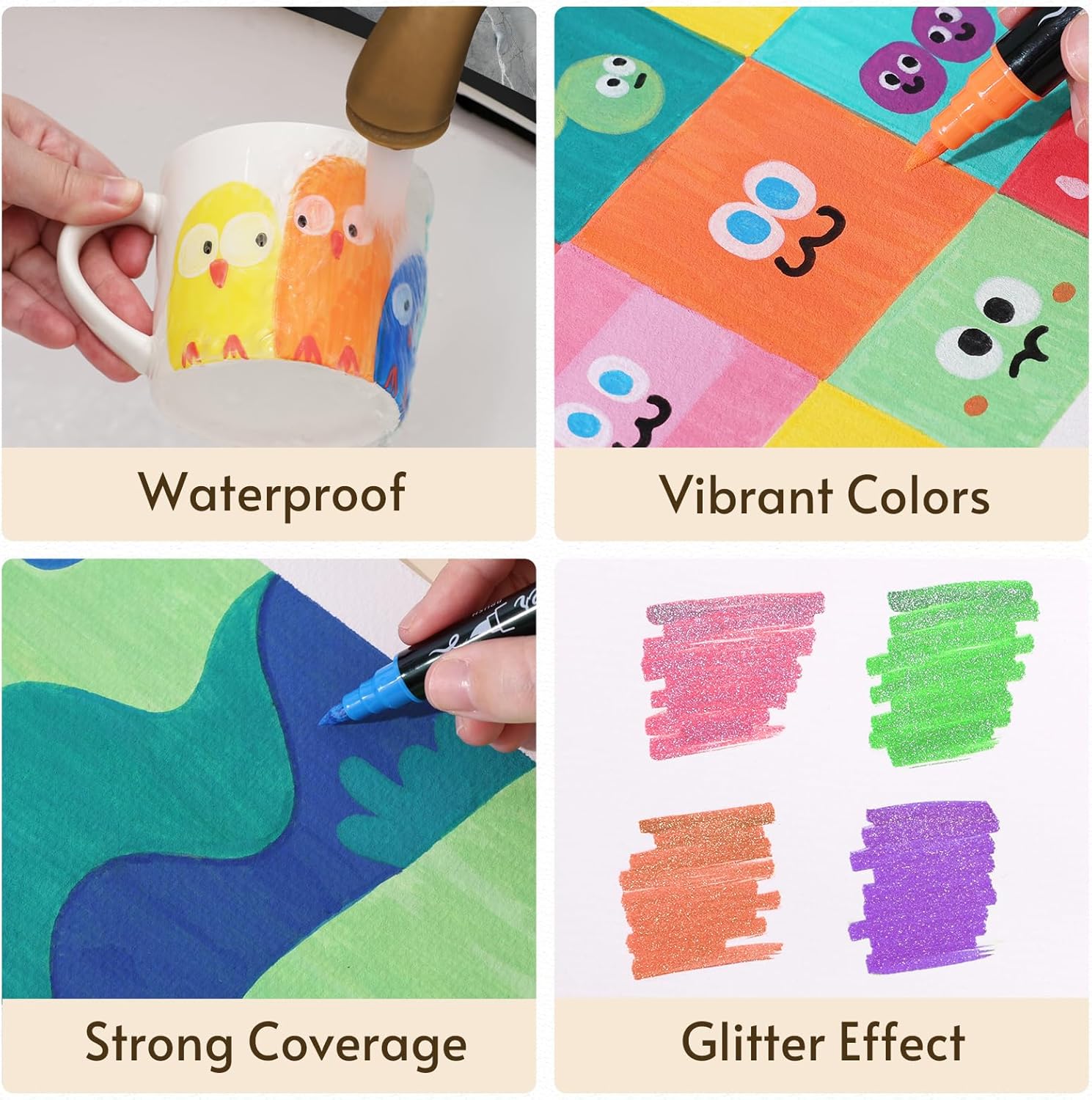 - Versatile Applications: The Glitter Ink offers dazzling, sparkly effects (recommended for paper surfaces). The Acrylic Ink is highly pigmented and opaque, allowing you to draw on dark surfaces like black cardstock, rock, and wood,glass β truly "Everything can be your canvas!" (with the acrylic markers).