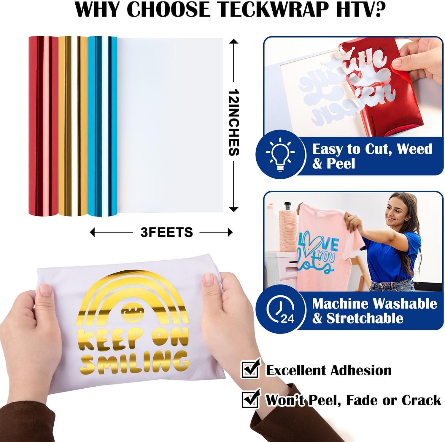 TECKWRAP HTV Iron On Vinyl Bundle, 6 Rolls 12" x3FT Chrome Metallic Heat Transfer Vinyl, Easy to Cut & Transfer, Perfect for T-Shirts, Hoodies, Bags & Crafts
