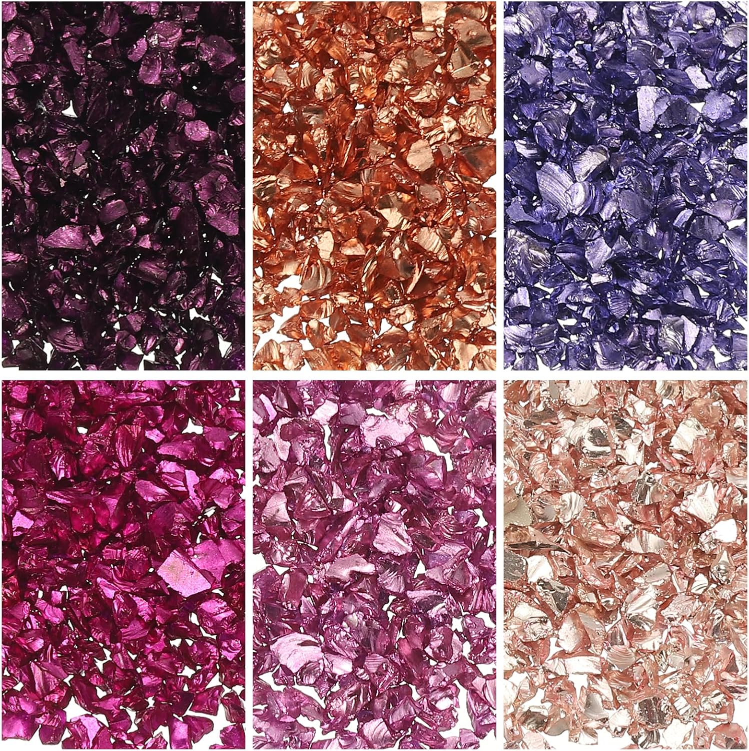 - What You Get: You will get 6 kinds of metallic colored crushed glass, which are irregular chips, about 1-3mm / 0.04-0.12". Each package contains a PP laser packaging bag, measuring 10cmx6.5cm (4"x2.6"), which is convenient for storage and repeated use