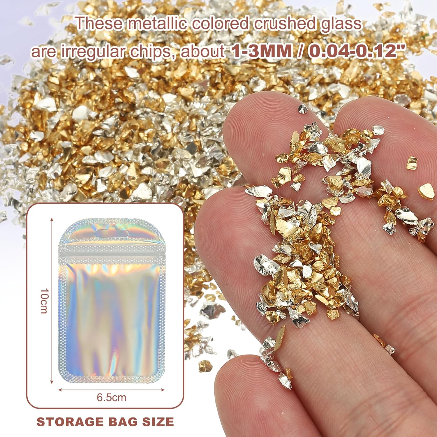- What You Get: You will get 6 kinds of metallic colored crushed glass, which are irregular chips, about 1-3mm / 0.04-0.12". Each package contains a PP laser packaging bag, measuring 10cmx6.5cm (4"x2.6"), which is convenient for storage and repeated use