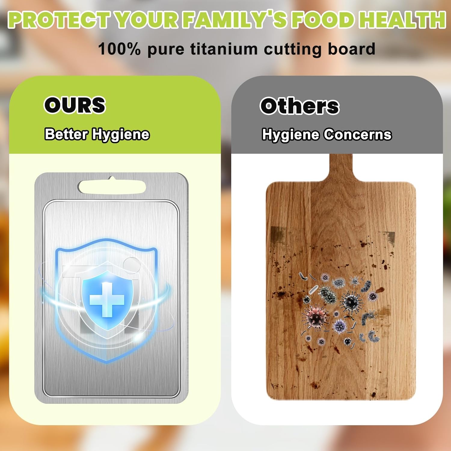 - 【PREMIUM TITANIUM CUTTING BOARD WITH JUICE GROOVE】Say hello to our pure titanium cutting board with juice groove! It solves all the common problems of traditional wooden or bamboo cutting boards—like deep knife marks, trapped food residue, and stubborn odors—for a cleaner, more hygienic prep experience The juice groove keeps your kitchen neat and organized