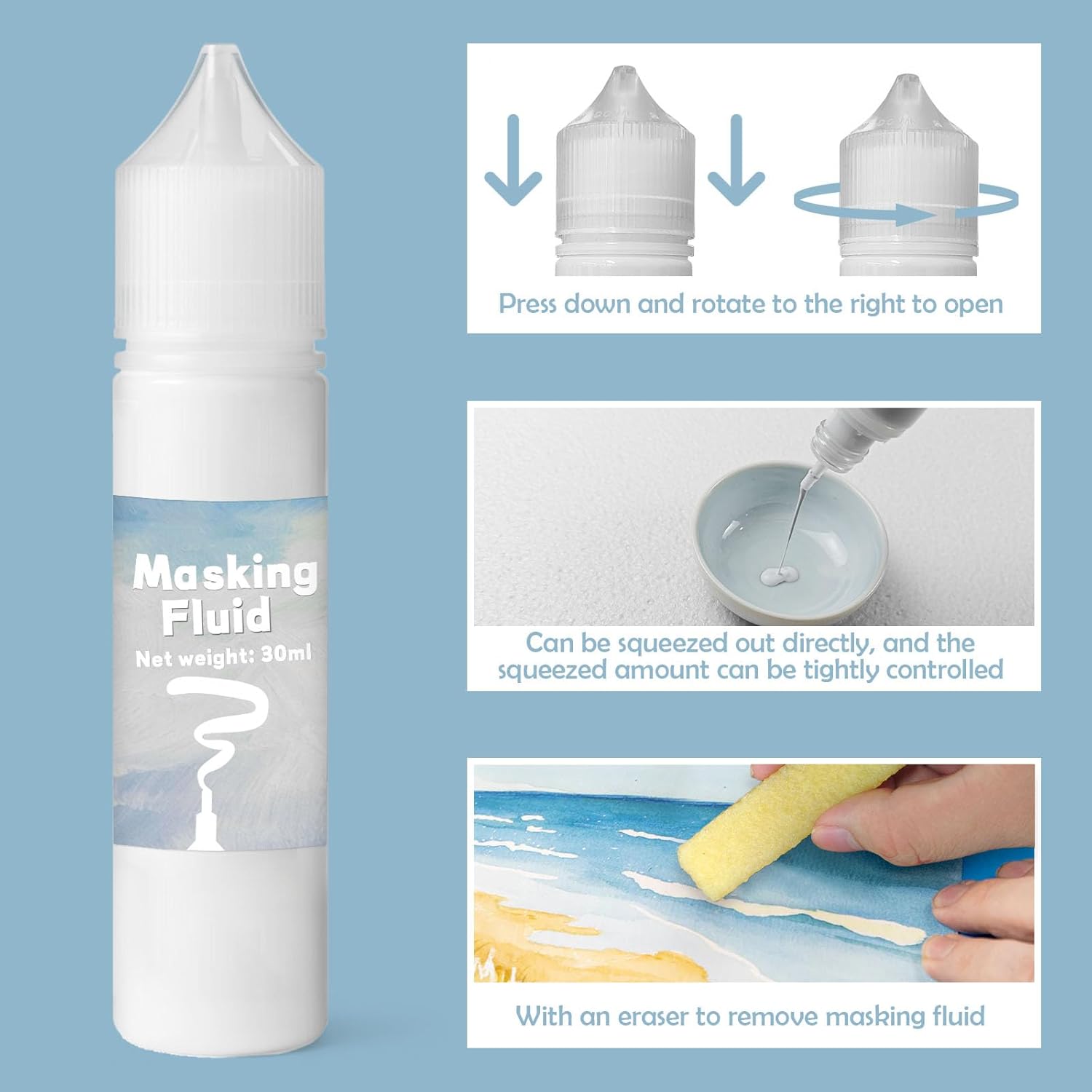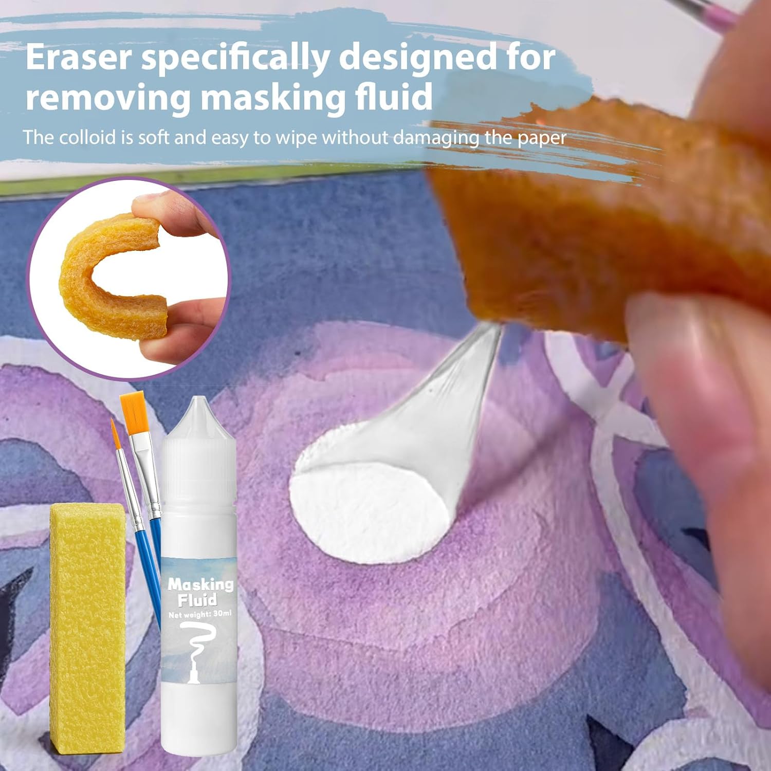 - Complete Set: Our watercolor masking fluid set includes 30ml of masking fluid, two brushes, and an eraser. These brushes are perfect for applying masking fluid to watercolors, and the set is complete and ready to use