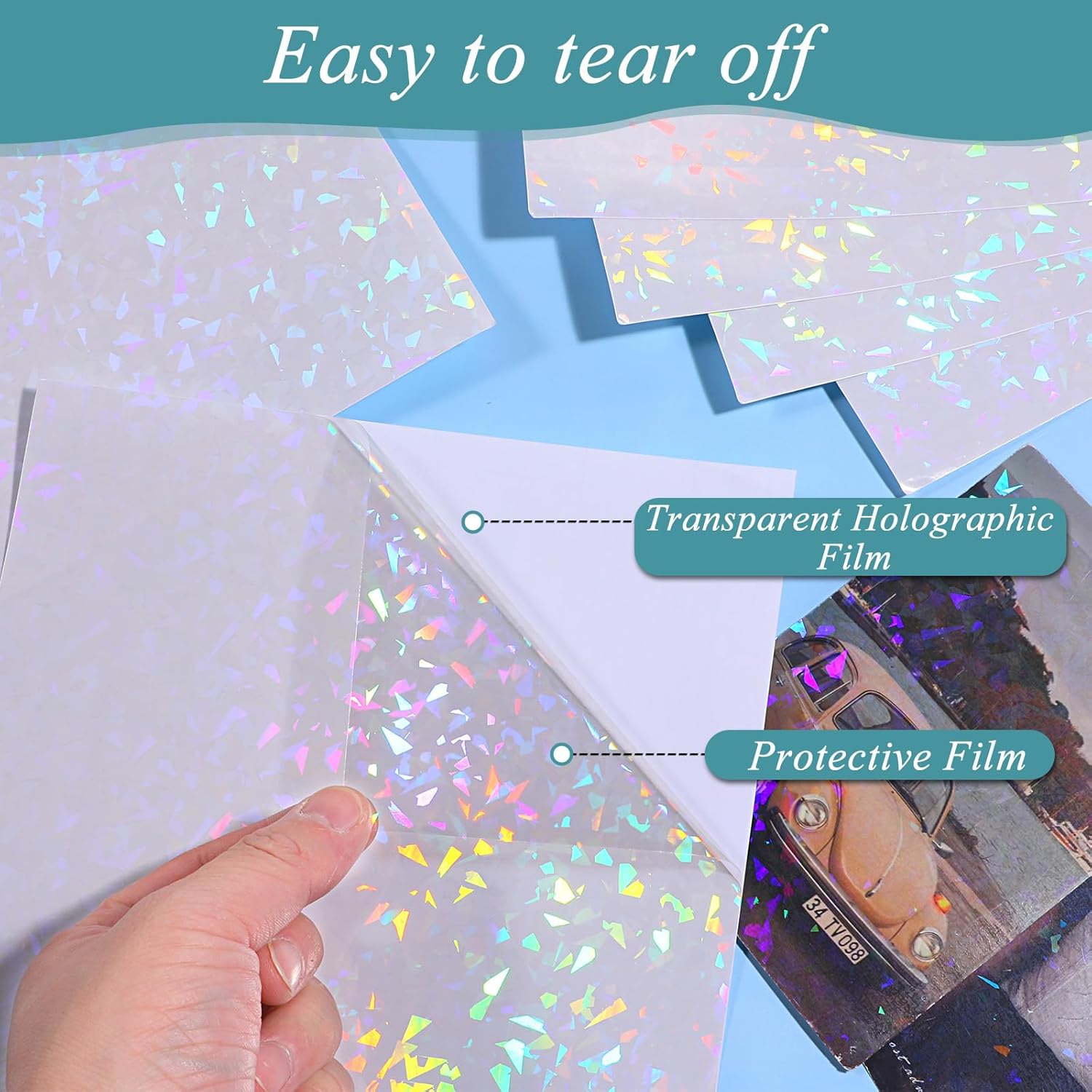 - Durable material: The material of these holographic transparent films is quality vinyl, which makes the holographic sticker paper sheets perform well as they are waterproof, anti-sunlight and quick-drying. At the same time, these transparent holographic films are also easy to cut, convenient to use and decorate most items without peeling off.