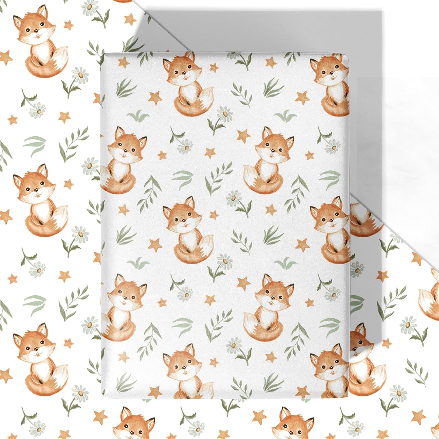 - Charming Fox Design: Fox Christmas Wrapping Paper features sweet watercolor-style foxes with stars floral and leaves on the white background