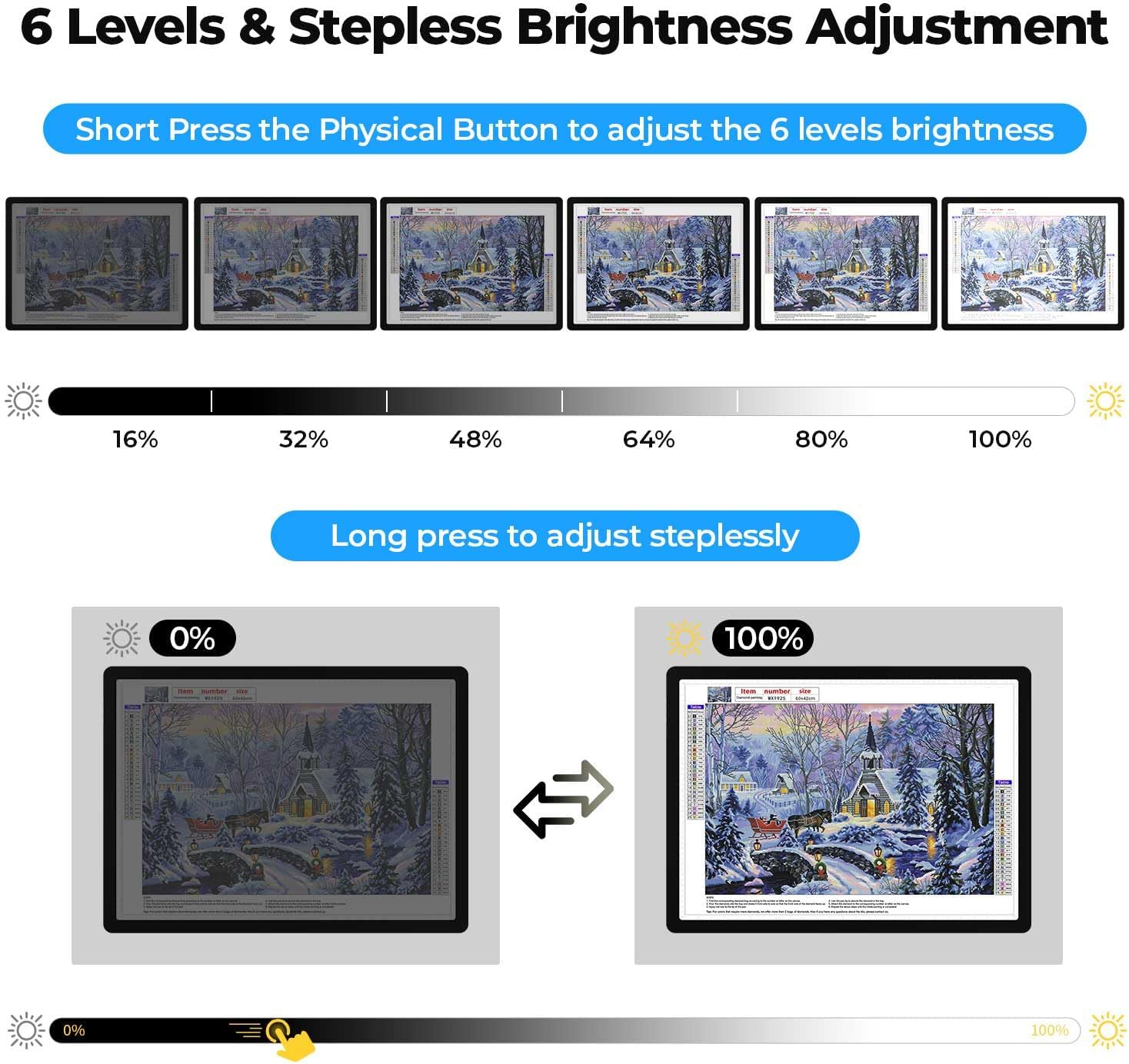 - 3 LIGHT COLORS & 6 LEVELS/STEPLESS DIMMABLE BRIGHTNESS -- Heanolier A2 diamond art light board has 3 light colors (white, warm, and mixed) and 6 Level/Stepless brightness settings. Short Press the Physical Button to adjust the 6 brightness levels OR Long Press the Physical Button to adjust the brightness evenly. Memory function will let the light pad automatically turn on the brightness you used last time. The A2 light pad MAX brightness reach to 4960 Lux in the surface, which is great tool for Detail Work or weeding vinyl.
