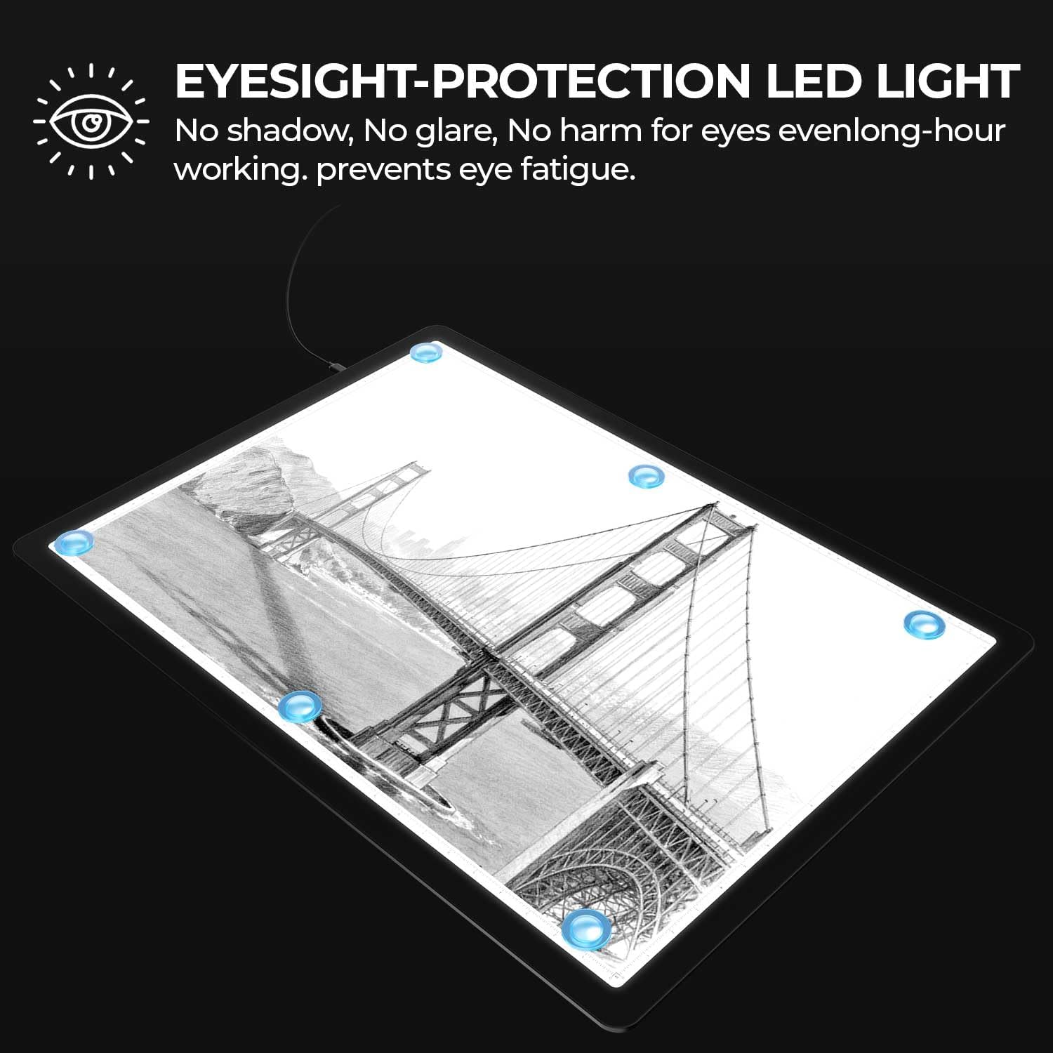 - EYESIGHT-PROTECTIVE DESIGN -- A2 light pad for Diamond painting with energy efficient flicker-free LED lamps, provides a perfectly even illustrated surface.