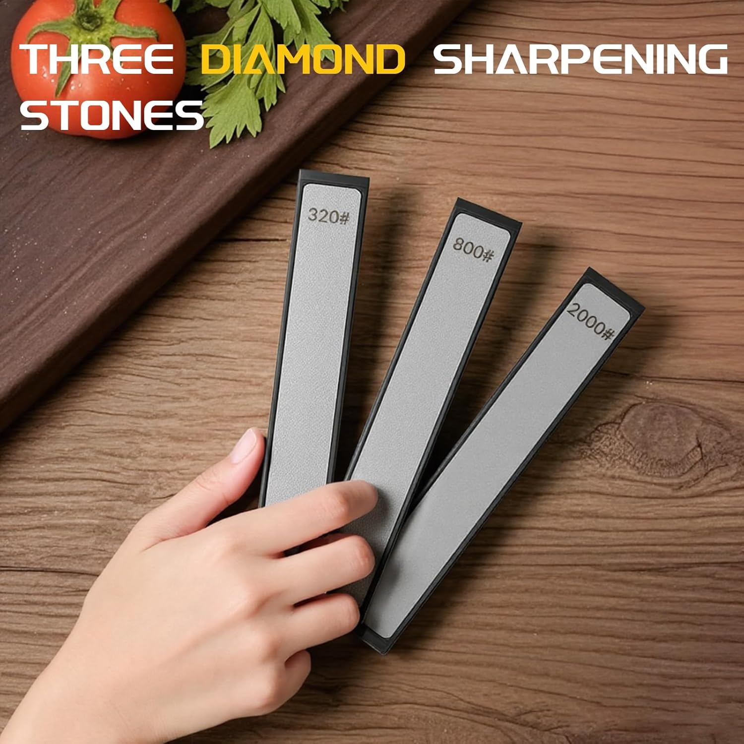 - Three Diamond Stones:Includes three diamond stones: 320 grit for repairing dull or damaged edges, 800 grit for sharpening, and 2000 grit for fine polishing. The plates are designed for effective material removal and edge refinement.