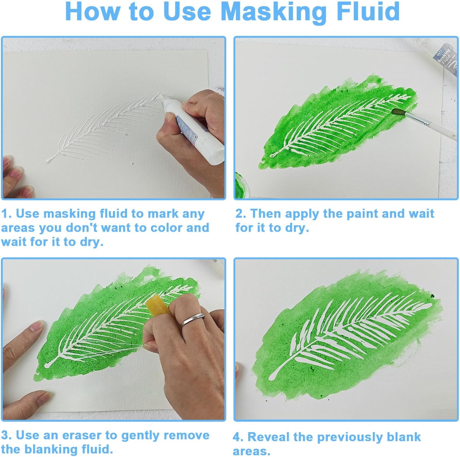 - Complete Masking Fluid Kit: Includes 30ml watercolor masking fluid, 2 brushes, and an eraser for precise coverage, detailed work, and beginner-friendly practice. Perfect for watercolor, ink, acrylics, and more.