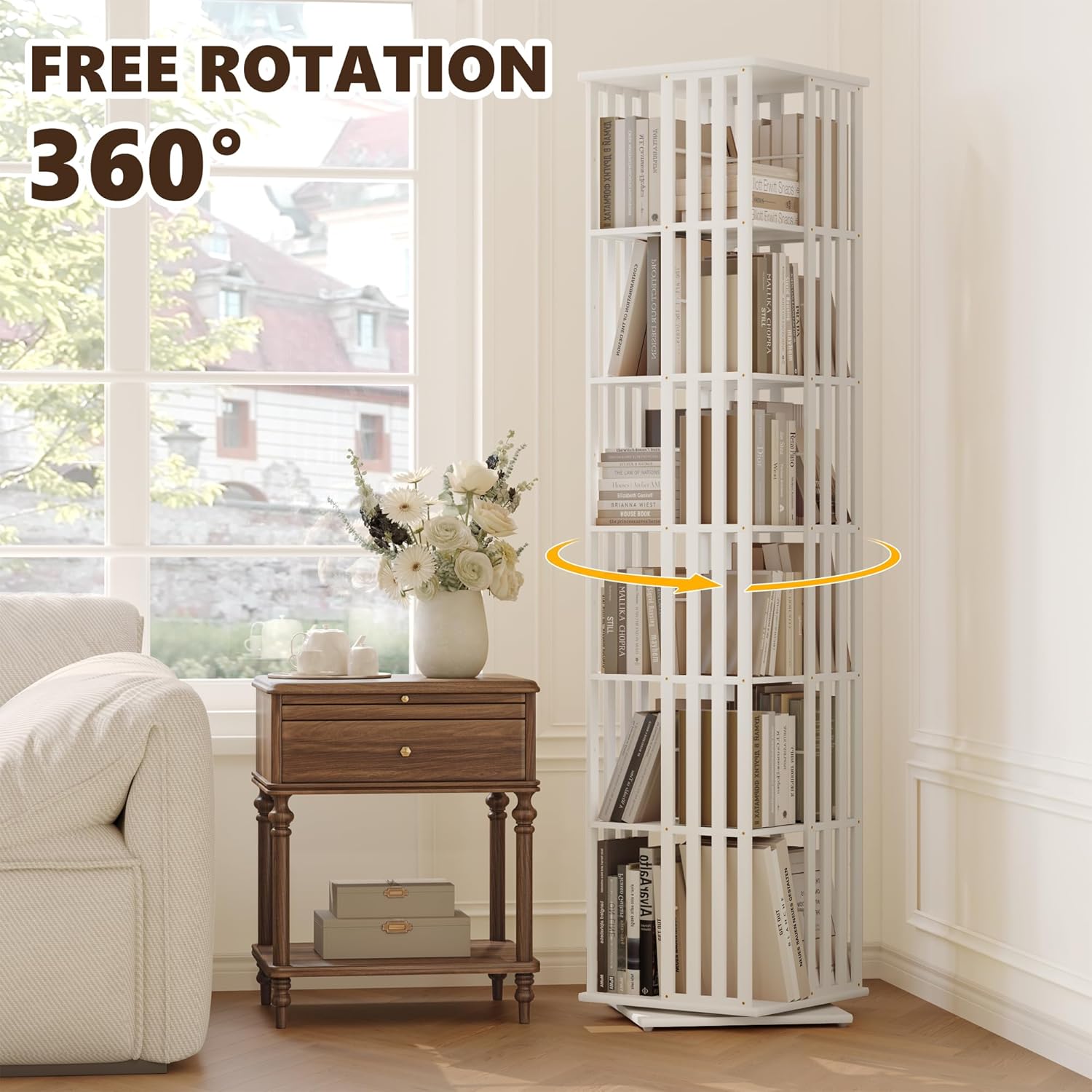 YOWOS Rotating Bookshelf Tower, 360 Display Spinning Bookcase, Bamboo Bookshelf Floor Standing Storage Rack, Wood Narrow Book Shelf Organizer for Kids&Adults (White, 6 Tier)