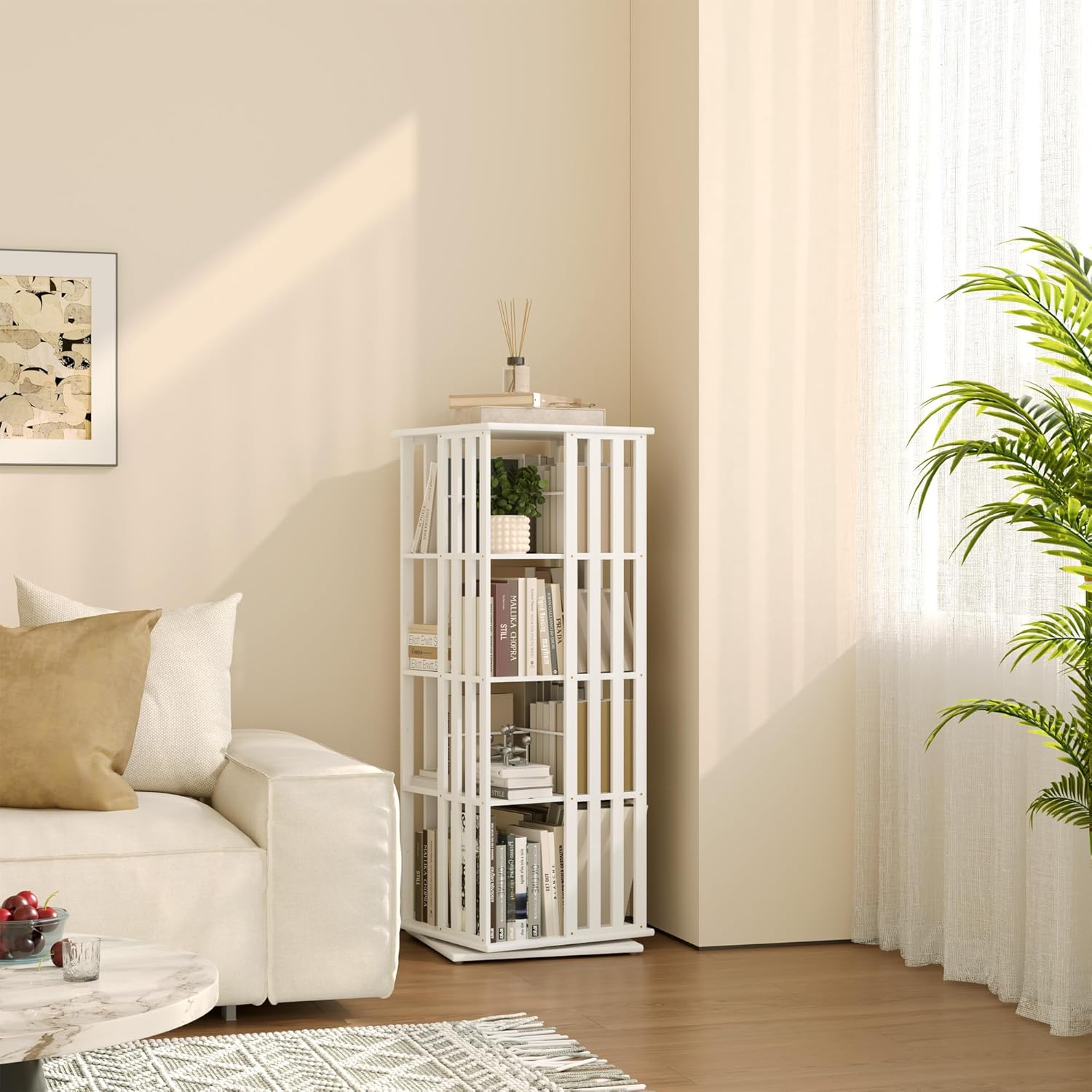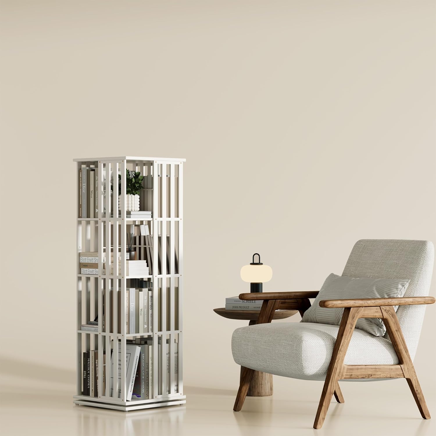 YOWOS Rotating Bookshelf Tower, 360 Display Spinning Bookcase, Bamboo Bookshelf Floor Standing Storage Rack, Wood Narrow Book Shelf Organizer for Kids&Adults (White, 4 Tier)
