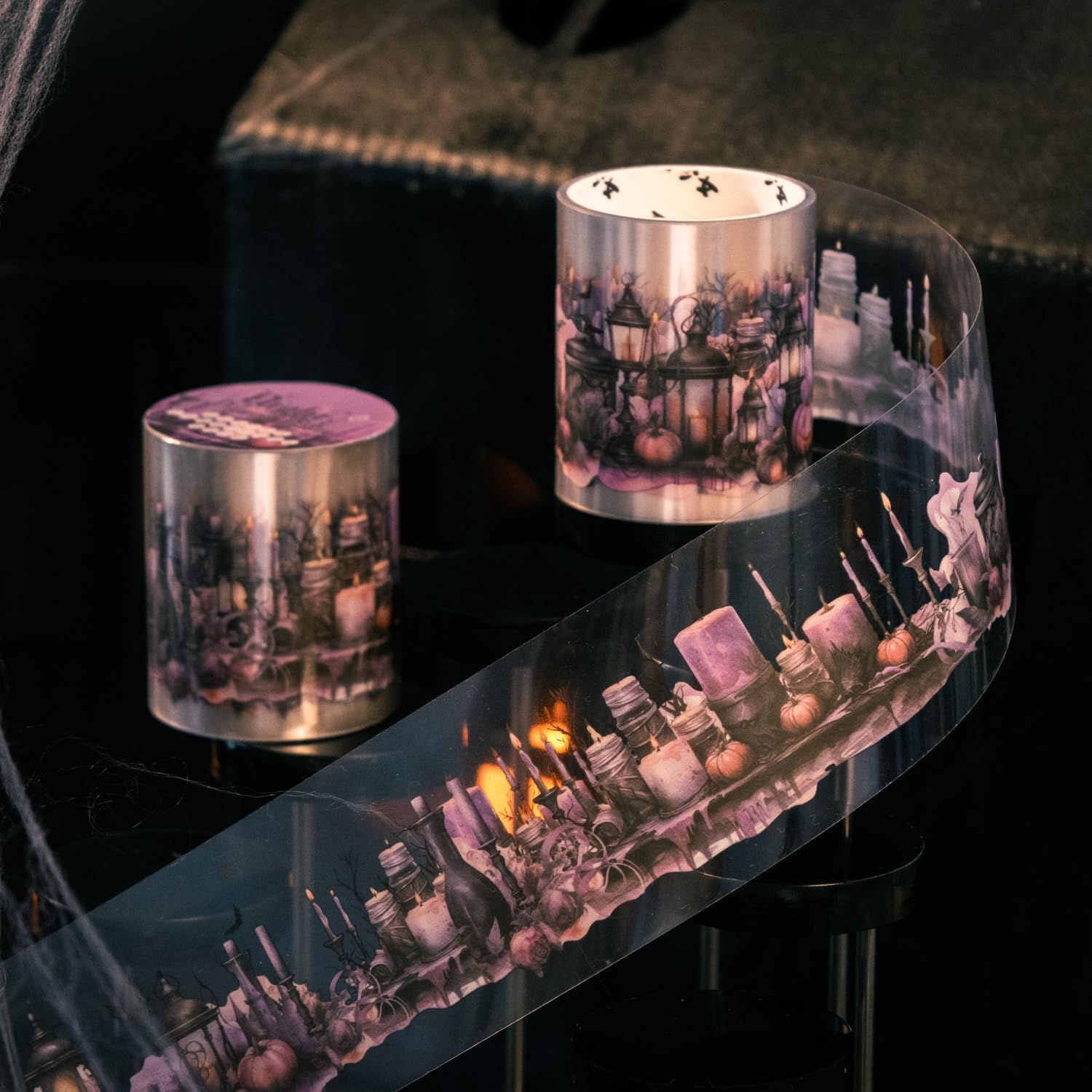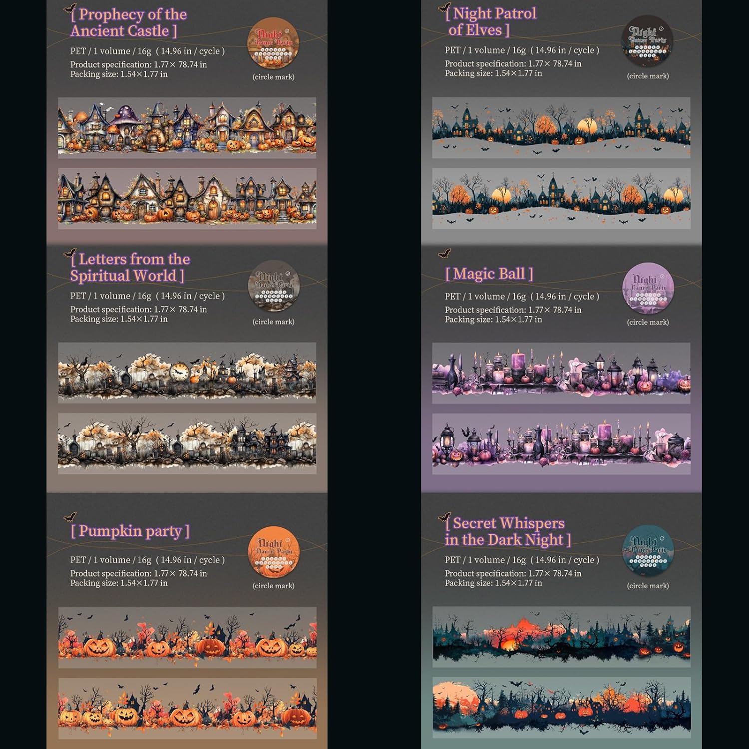 - Halloween PET Washi Tape:The tape set contains 6 rolls of halloween themes.There are elements such as pumpkin,bat,alarm clock,candle,crow,castle ect