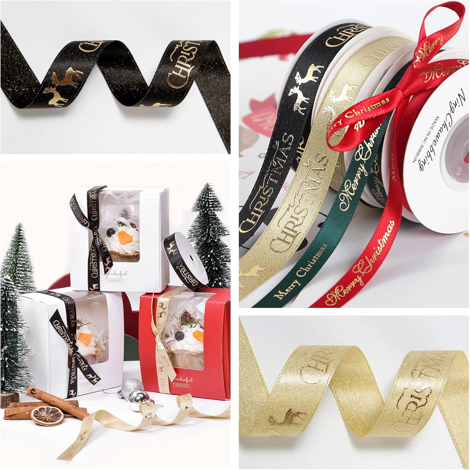 Christmas Gift Wrapping Ribbon, Red, Green, 2 Rolls Printed Grosgrain Ribbons for Crafts, Floral Bouquets, Sewing, Party and Festive Holiday Decor (2 Rolls(Black/Gold), 1 Rolls=5/8in * 5Yards)