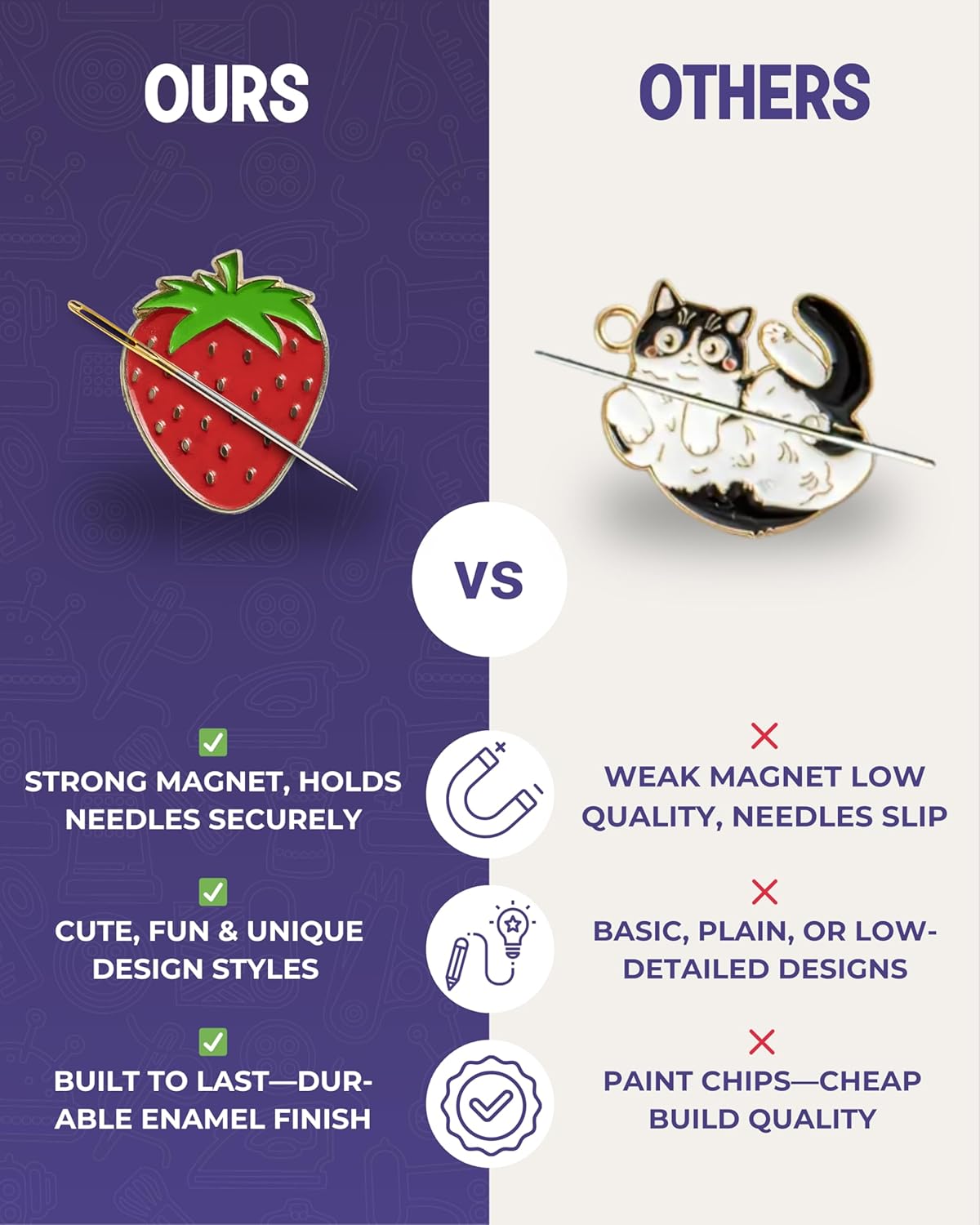 - Choose from Stylish Designs: Add personality to your sewing kit with our enamel needle minders. Our needle minder complements your sewing notions & supplies. Perfect for enhancing your embroidery needle and needlepoint accessories collection with flower magnets and more to match your stitching style.