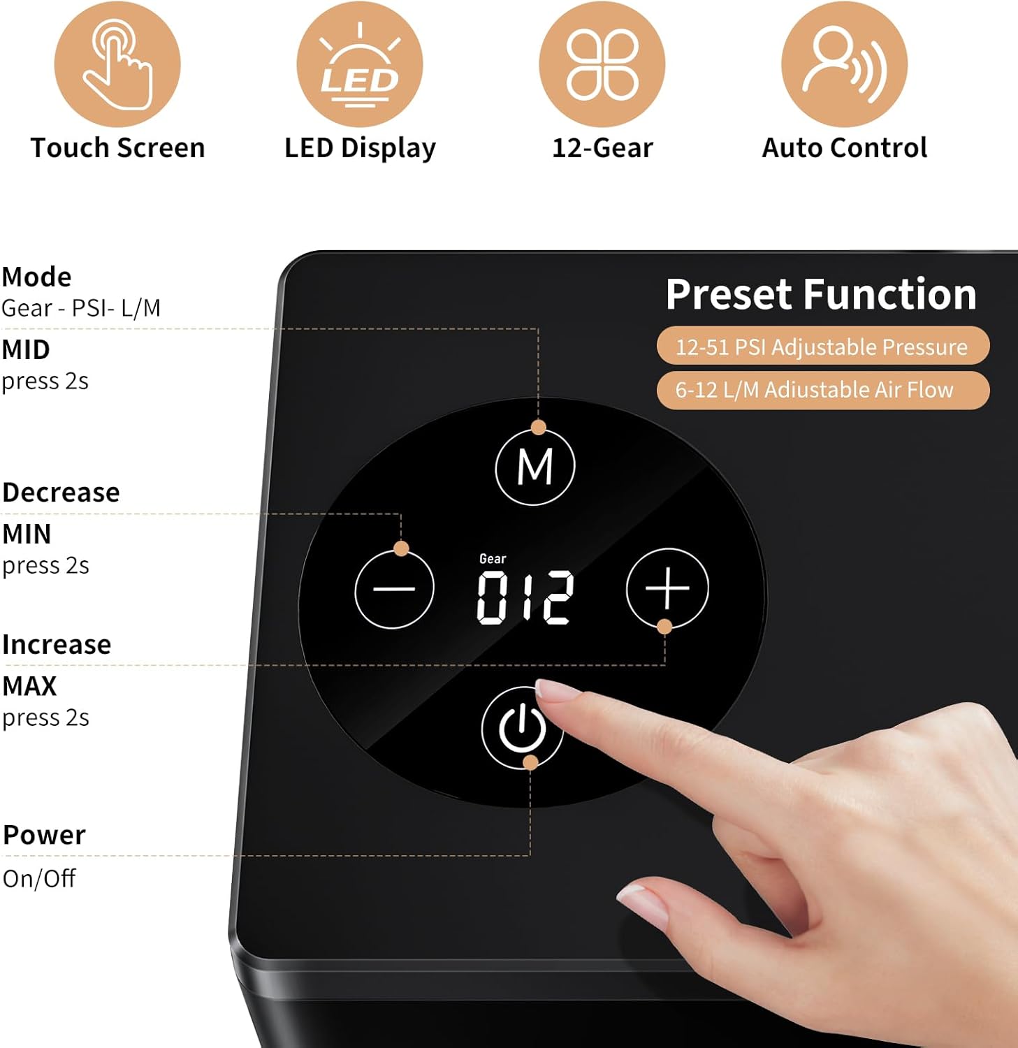 - Stable Airflow, Touch Sensing Control: With 12 gear touch sensing, the digital displayed on the LED screen, auto start stop technology, preset air pressure airflow,the smart air compressor is ensuring powerful and stable airflow for your airbrush kit. With just one touch to achieve different paint atomization effects.