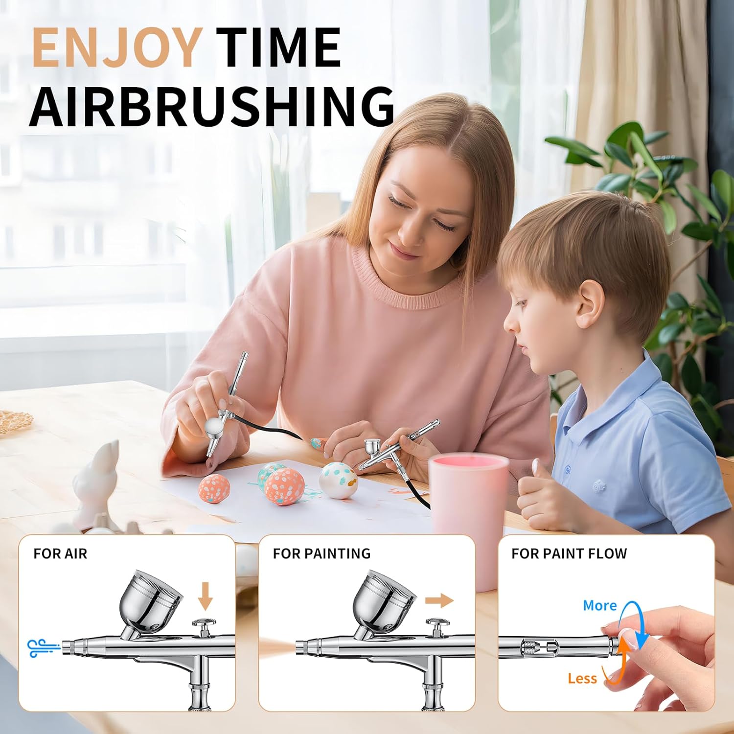 - Dual-Action Airbrush Kit, Wide Range Air Pressure: Improved air pressure adjustment design with 12-51PSI options for your artwork, you can easily achieve the desired effect, making it perfect for both beginners and professionals. Equipped with quick connector, connected and disconnected without the need for screws increasing efficiency.