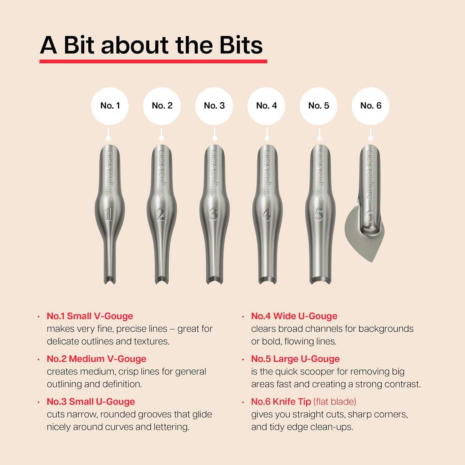 - PRECISION CARVING TOOLS: Master your craft with 6 interchangeable blades: from fine V-gouges for delicate lines, to U-gouges for smooth curves, to a sharp knife tip for clean cuts. Every detail has the right tool.