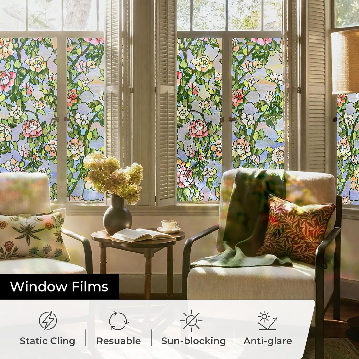 - UV Protection and Energy Efficiency -Our stained glass window film shields interiors from UV rays, preserving furniture and decor. It also enhances energy efficiency by balancing temps, keeping spaces cozy in all seasons.