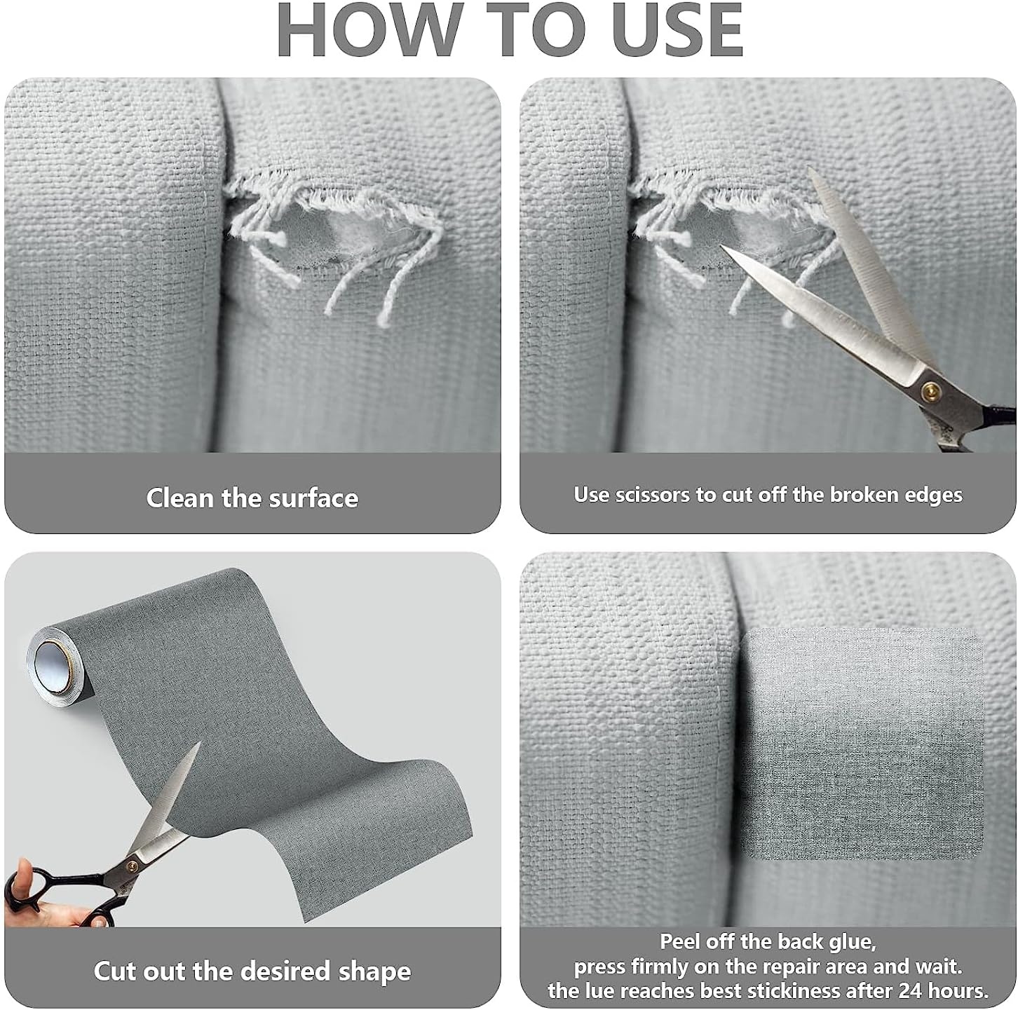 - EASY TO USE: Just peel the fabric adhesive patch backing paper then stick repair patch on holes, rips and stains in linen or canvas fabric couch, car seats or other fabric product. It only takes a few seconds to complete the maintenance work.